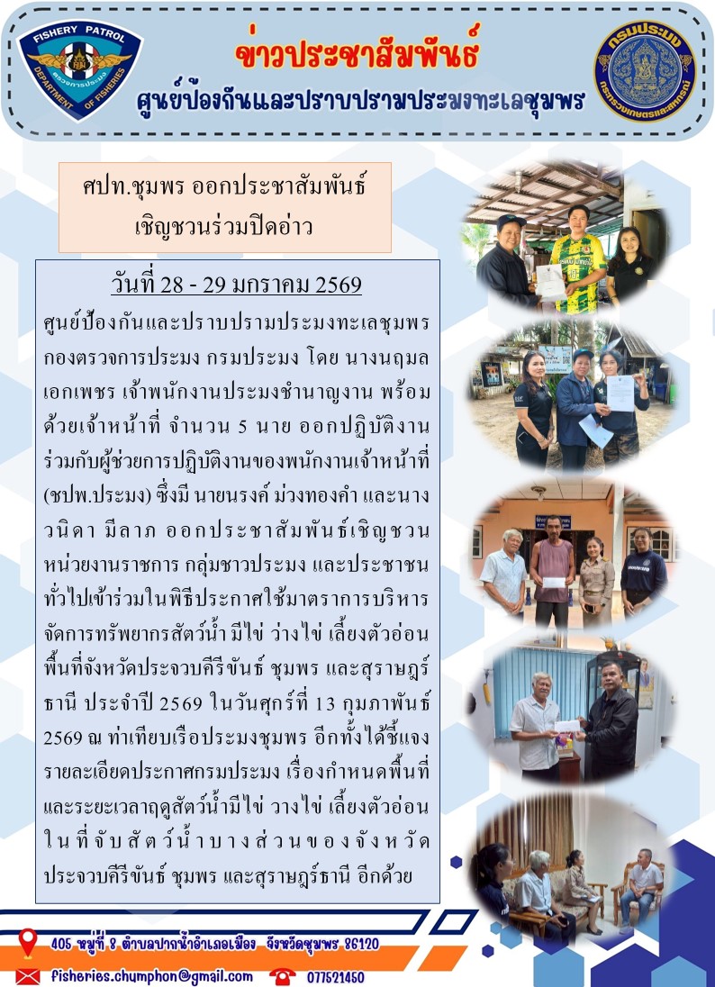 วันที่ 28 - 29 มกราคม 2569 ศูนย์ป้องกันเเละปราบปรามประมงทะเลชุมพร กองตรวจการประมง กรมประมง โดย นางนฤมล เอกเพชร เจ้าพนักงานประมงชำนาญงาน พร้อมด้วยเจ้าหน้าที่ จำนวน 5 นาย ออกปฏิบัติงานร่วมกับผู้ช่วยการปฏิบัติงานของพนักงานเจ้าหน้าที่ (ชปพ.ประมง) ซึ่งมี นายนรงค์ ม่วงทองคำ เเละนางวนิดา มีลาภ ออกประชาสัมพันธ์เชิญชวนหน่วยงานราชการ กลุ่มชาวประมง เเละประชาชนทั่วไปเข้าร่วมในพิธีประกาศใช้มาตราการบริหารจัดการทรัพยากรสัตว์น้ำ มีไข่ ว่างไข่ เลี้ยงตัวอ่อน พื้นที่จังหวัดประจวบคีรีขันธ์ ชุมพร เเละสุราษฎร์ธานี ประจำปี 2569 ในวันศุกร์ที่ 13 กุมภาพันธ์ 2569 ณ ท่าเทียบเรือประมงชุมพร อีกทั้งได้ชี้เเจงรายละเอียดประกาศกรมประมง เรื่องกำหนดพื้นที่เเละระยะเวลาฤดูสัตว์น้ำมีไข่ วางไข่ เลี้ยงตัวอ่อน ในที่จับสัตว์น้ำบางส่วนของจังหวัดประจวบคีรีขันธ์ ชุมพร เเละสุราษฎร์ธานี อีกด้วย