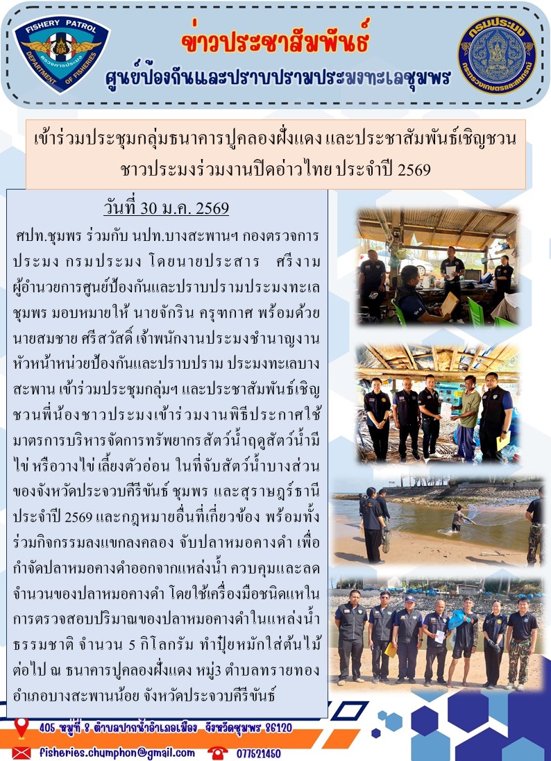 วันที่ 30 ม.ค. 2569 ศปท.ชุมพร ร่วมกับ นปท.บางสะพานฯ กองตรวจการประมง กรมประมง โดยนายประสาร ศรีงาม ผู้อำนวยการศูนย์ป้องกันและปราบปรามประมงทะเลชุมพร มอบหมายให้ นายจักริน ครุฑกาศ พร้อมด้วย นายสมชาย ศรีสวัสดิ์ เจ้าพนักงานประมงชำนาญงาน หัวหน้าหน่วยป้องกันและปราบปราม ประมงทะเลบางสะพาน เข้าร่วมประชุมกลุ่มฯ และประชาสัมพันธ์เชิญชวนพี่น้องชาวประมงเข้าร่วมงานพิธีประกาศใช้มาตรการบริหารจัดการทรัพยากรสัตว์น้ำฤดูสัตว์น้ำมีไข่ หรือวางไข่ เลี้ยงตัวอ่อน ในที่จับสัตว์น้ำบางส่วนของจังหวัดประจวบคีรีขันธ์ ชุมพร และสุราษฎร์ธานี ประจำปี 2569 และกฎหมายอื่นที่เกี่ยวข้อง พร้อมทั้งร่วมกิจกรรมลงแขกลงคลอง จับปลาหมอคางดำ เพื่อกำจัดปลาหมอคางดำออกจากแหล่งน้ำ ควบคุมและลดจำนวนของปลาหมอคางดำ โดยใช้เครื่องมือชนิดแหในการตรวจสอบปริมาณของปลาหมอคางดำในแหล่งน้ำธรรมชาติ จำนวน 5 กิโลกรัม ทำปุ๋ยหมักใส่ต้นไม้ต่อไป ณ ธนาคารปูคลองฝั่งแดง หมู่3 ตำบลทรายทอง อำเภอบางสะพานน้อย จังหวัดประจวบคีรีขันธ์