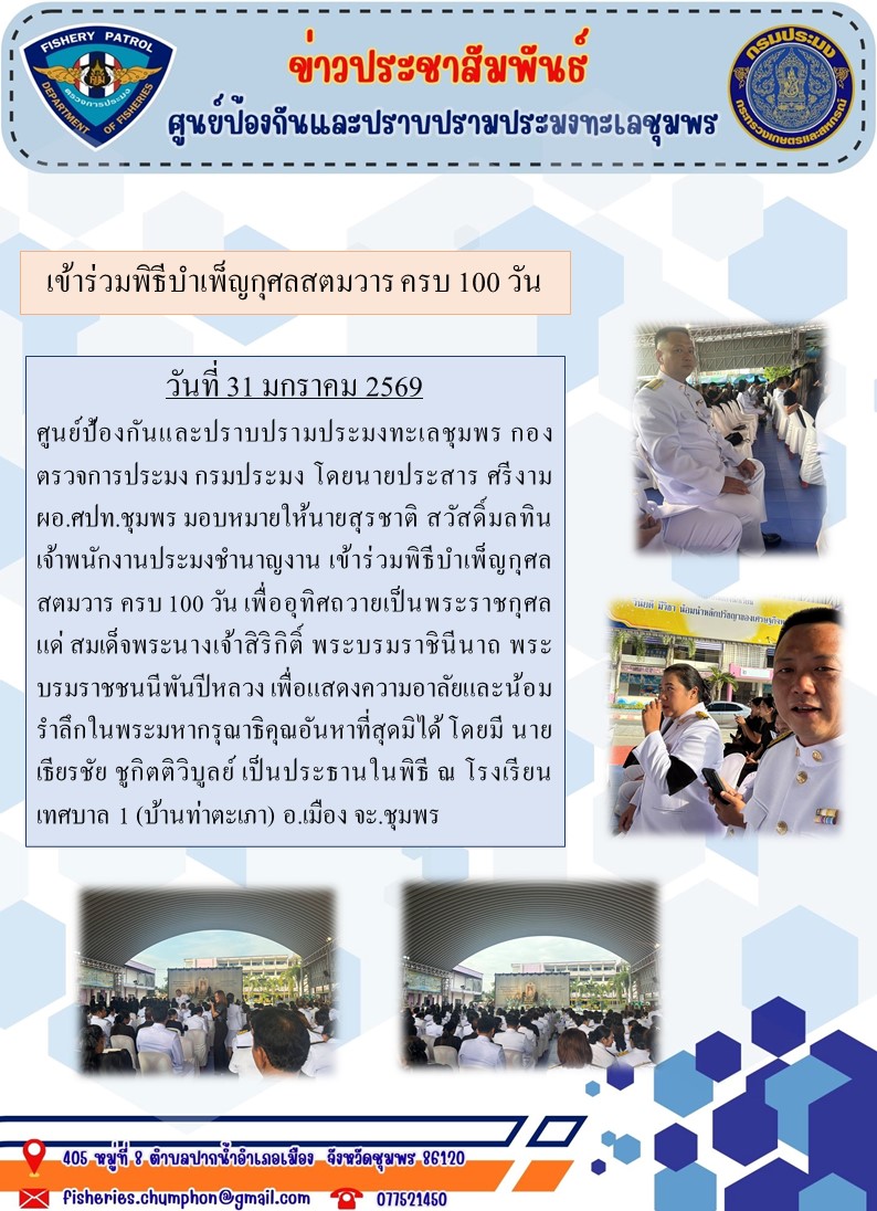 วันที่ 31 มกราคม 2569 ศูนย์ป้องกันและปราบปรามประมงทะเลชุมพร กองตรวจการประมง กรมประมง โดยนายประสาร ศรีงาม ผอ.ศปท.ชุมพร มอบหมายให้นายสุรชาติ สวัสดิ์มลทิน เจ้าพนักงานประมงชำนาญงาน เข้าร่วมพิธีบำเพ็ญกุศลสตมวาร ครบ 100 วัน เพื่ออุทิศถวายเป็นพระราชกุศลแด่ สมเด็จพระนางเจ้าสิริกิติ์ พระบรมราชินีนาถ พระบรมราชชนนีพันปีหลวง เพื่อแสดงความอาลัยและน้อมรำลึกในพระมหากรุณาธิคุณอันหาที่สุดมิได้ โดยมี นายเธียรชัย ชูกิตติวิบูลย์ เป็นประธานในพิธี ณ โรงเรียนเทศบาล 1 (บ้านท่าตะเภา) อ.เมือง จะ.ชุมพร