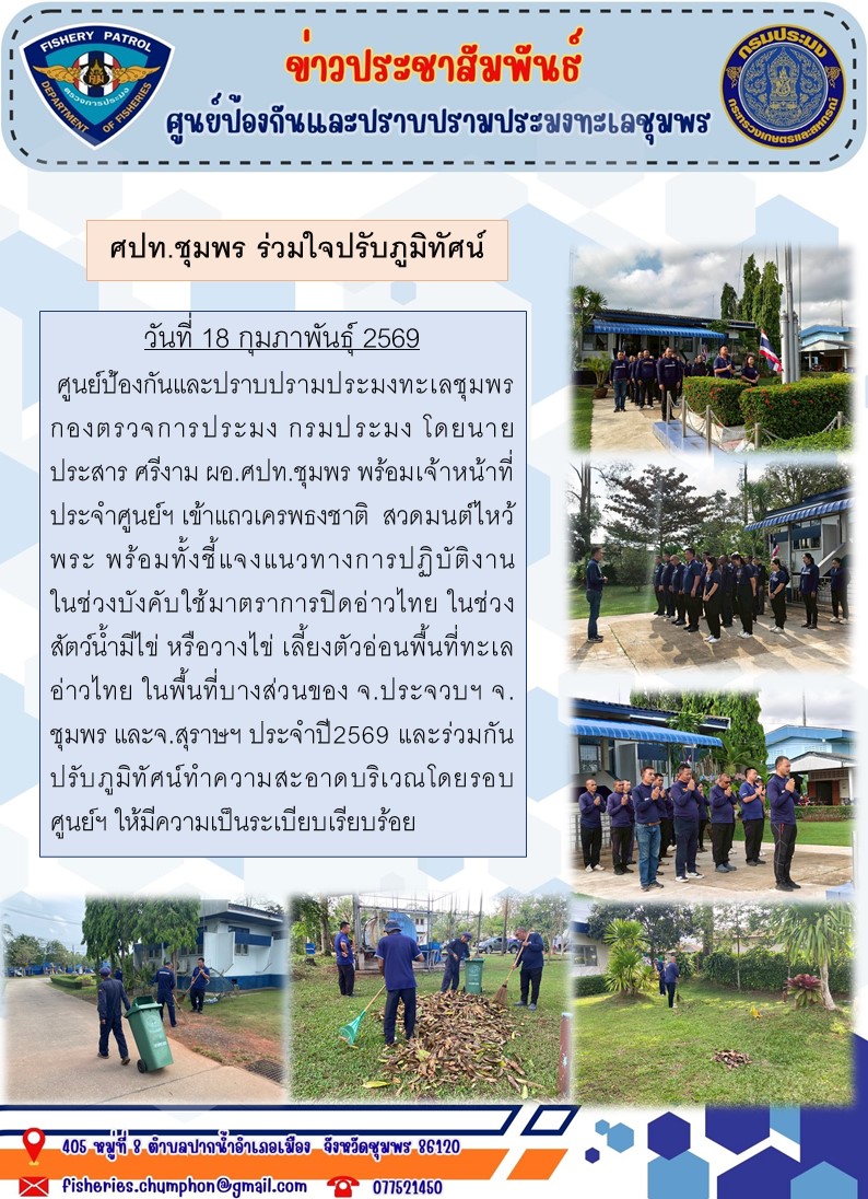 วันที่ 18 กุมภาพันธุ์ 2569 ศูนย์ป้องกันและปราบปรามประมงทะเลชุมพร กองตรวจการประมง กรมประมง โดยนายประสาร ศรีงาม ผอ.ศปท.ชุมพร พร้อมเจ้าหน้าที่ประจำศูนย์ฯ เข้าแถวเครพธงชาติ สวดมนต์ไหว้พระ พร้อมทั้งชี้แจงแนวทางการปฏิบัติงานในช่วงบังคับใช้มาตราการปิดอ่าวไทย ในช่วงสัตว์น้ำมีไข่ หรือวางไข่ เลี้ยงตัวอ่อนพื้นที่ทะเลอ่าวไทย ในพื้นที่บางส่วนของ จ.ประจวบฯ จ.ชุมพร และจ.สุราษฯ ประจำปี2569 และร่วมกันปรับภูมิทัศน์ทำความสะอาดบริเวณโดยรอบศูนย์ฯ ให้มีความเป็นระเบียบเรียบร้อย
