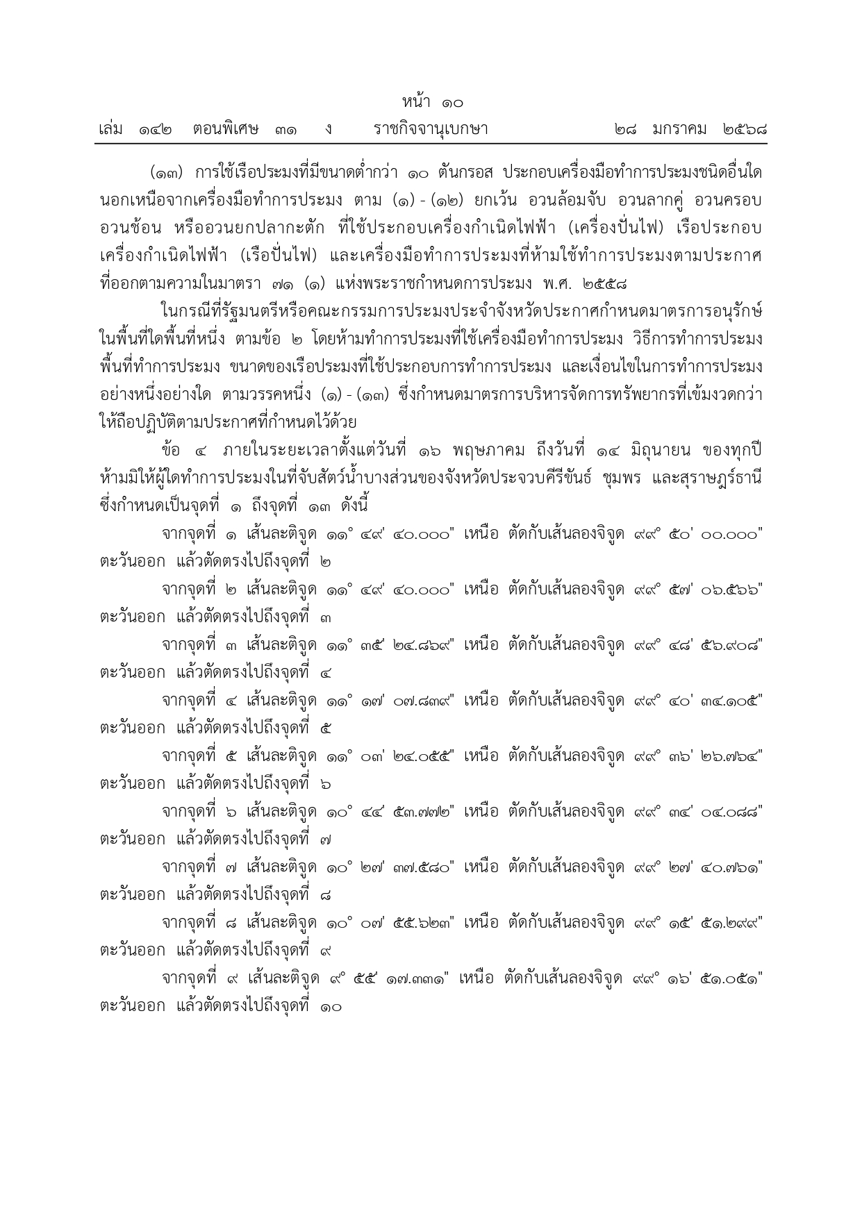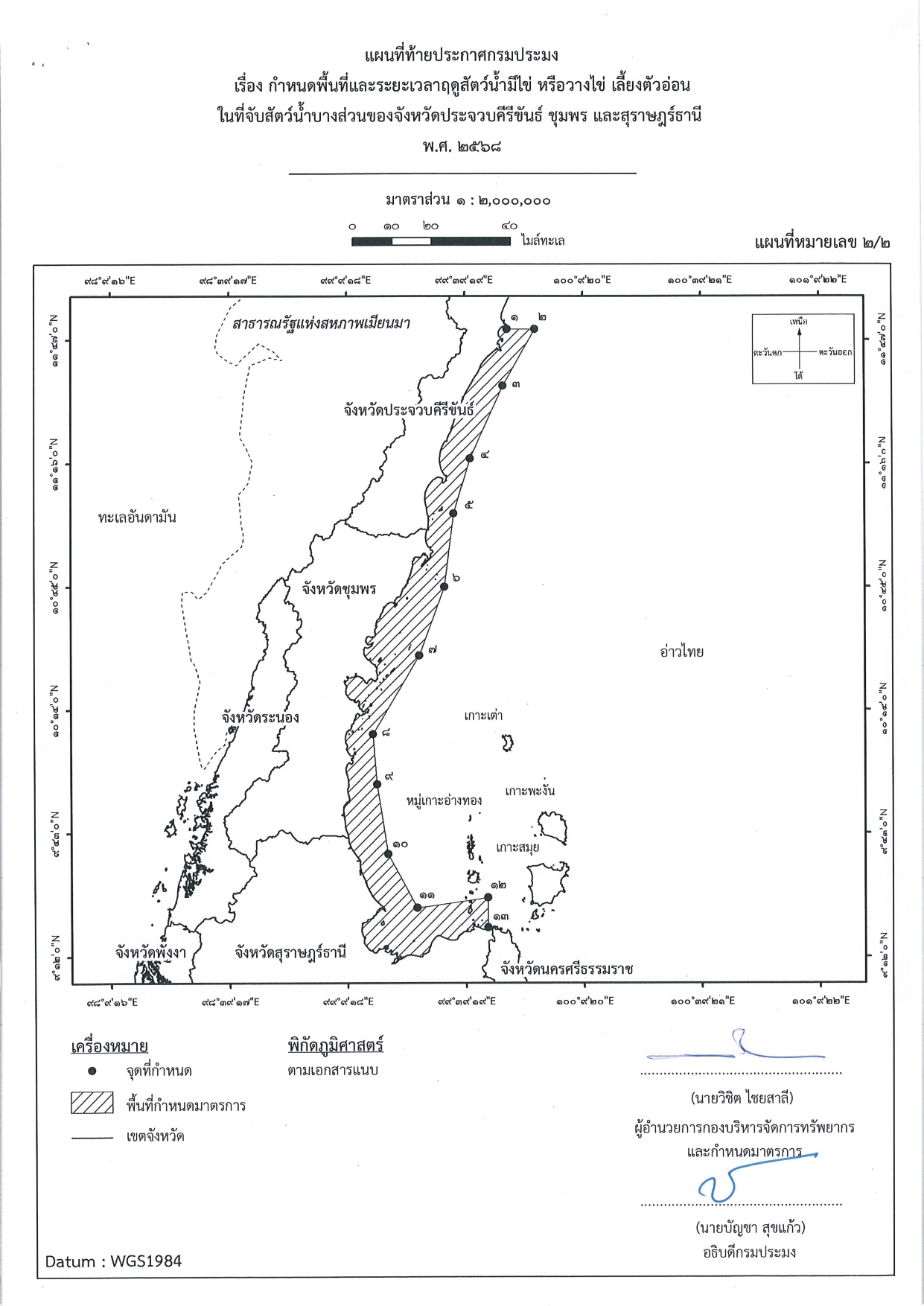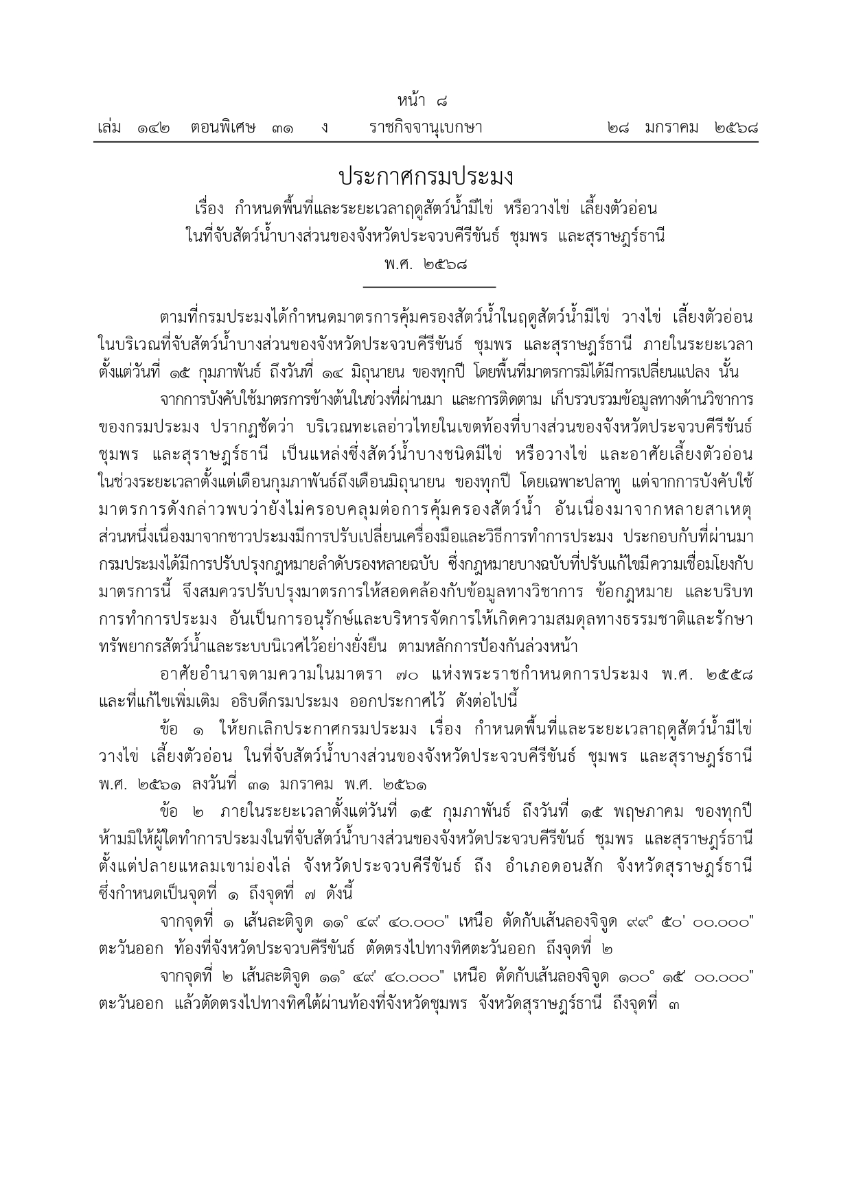 กำหนดพื้นที่และระยะเวลาฤดูสัตว์น้ำมีไข่ หรือวางไข่ เลี้ยงตัวอ่อน ในที่จับสัตว์น้ำบางส่วนของจังหวัดประจวบคีรีขันธ์ ชุมพร และสุราษฎร์ธานี พ.ศ. 2568