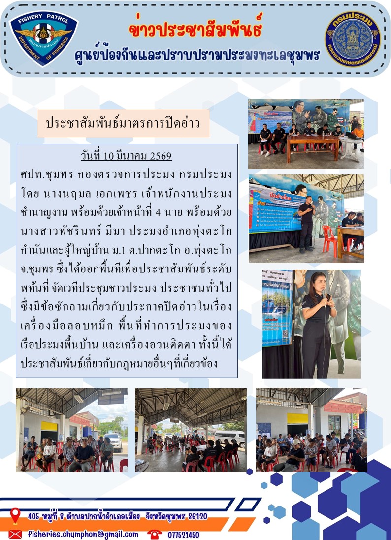 วันที่ 10 มีนาคม 2569 ศปท.ชุมพร กองตรวจการประมง กรมประมง โดย นางนฤมล เอกเพชร เจ้าพนักงานประมงชำนาญงาน พร้อมด้วยเจ้าหน้าที่ 4 นาย พร้อมด้วยนางสาวพัชรินทร์ มีมา ประมงอำเภอทุ่งตะโก กำนันและผู้ใหญ่บ้าน ม.1 ต.ปากตะโก อ.ทุ่งตะโก จ.ชุมพร ซึ่งได้ออกพื้นทีเพื่อประชาสัมพันธ์ระดับพท้นที่ จัดเวทีประชุมชาวประมง ประชาชนทั่วไปซึ่งมีข้อซักถามเกี่ยวกับประกาศปิดอ่าวในเรื่องเครื่องมือลอบหมึก พื้นที่ทำการประมงของเรือประมงพื้นบ้าน และเครื่องอวนติดตา ทั้งนี้ได้ประชาสัมพันธ์เกี่ยวกับกฏหมายอื่นๆที่เกี่ยวข้อง