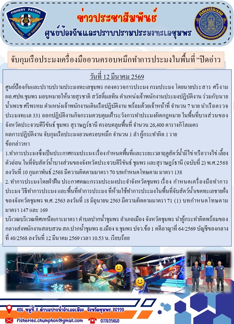 วันที่ 12 มีนาคม 2569 ศูนย์ป้องกันและปราบปรามประมงทะเลชุมพร กองตรวจการประมง กรมประมง โดยนายประสาร ศรีงาม ผอ.ศปท.ชุมพร มอบหมายให้นายสุรชาติ สวัสดิ์มลทิน ตำแหน่งเจ้าพนักงานประมงปฏิบัติงาน ร่วมกับนายน้ำเพรช ศรีพรหม ตำแหน่งเจ้าพนักงานเดินเรือปฏิบัติงาน พร้อมด้วยเจ้าหน้าที่ จำนวน 7 นาย นำเรือตรวจประมงทะเล 331 ออกปฏิบัติงานกิจกรรมควบคุมเฝ้าระวังการทำประมงผิดกฎหมาย ในพื้นที่บางส่วนของจังหวัดประจวบคีรีขันธ์ ชุมพร สุราษฏร์ธานี ครอบคลุมพื้นที่ จำนวน 26,400 ตารางกิโลเมตร
