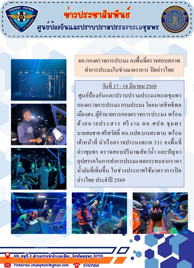 วันที่ 17 - 18 มีนาคม 2569 ศูนย์ป้องกันและปราบปรามประมงทะเลชุมพร กองตรวจการประมง กรมประมง โดยนายสิทธิพล เมืองสง. ผู้อำนวยการกองตรวจการประมง พร้อมด้วยนายประสาร ศรีงาม ผอ.ศปท.ชุมพร นายสมชาย ศรีสวัสดิ์ หน.นปท.บางสะพาน พร้อมเจ้าหน้าที่ นำเรือตรวจประมงทะเล 331 ลงพื้นที่อ่าวชุมพร ตรวจสอบปริมาณสัตว์น้ำ และปัญหาอุปสรรคในการทำการประมง ผลกระทบจากราคาน้ำมันที่เพิ่มขึ้น ในช่วงประกาศใช้มาตราการปิดอ่าวไทย ประจำปี 2569