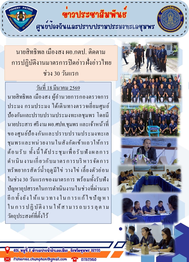 วันที่ 18 มีนาคม 2569 นายสิทธิพล เมืองสง ผู้อำนวยการกองตรวจการประมง กรมประมง ได้เดินทางตรวจเยี่ยมศูนย์ป้องกันและปราบปรามประมงทะเลชุมพร โดยมี นายประสาร ศรีงาม ผอ.ศปท.ชุมพร และเจ้าหน้าที่ของศูนย์ป้องกันและปราบปรามประมงทะเลชุมพรและหน่วยงานในสังกัดเข้าแถวให้การต้อนรับ ทั้งนี้ได้ประชุมเพื่อรับฟังผลการดำเนินงานเกี่ยวกับมาตรการบริหารจัดการทรัพยากรสัตว์น้ำฤดูมีไข่ วางไข่ เลี้ยงตัวอ่อนในช่วง 30 วันแรกของมาตรการ พร้อมทั้งรับฟังปัญหาอุปสรรคในการดำเนินงานในช่วงที่ผ่านมา อีกทั้งยังให้แนวทางในการแก้ไขปัญหา ในการปฏิบัติงานให้สามารถบรรลุตามวัตถุประสงค์ ที่ตั้งไว้
