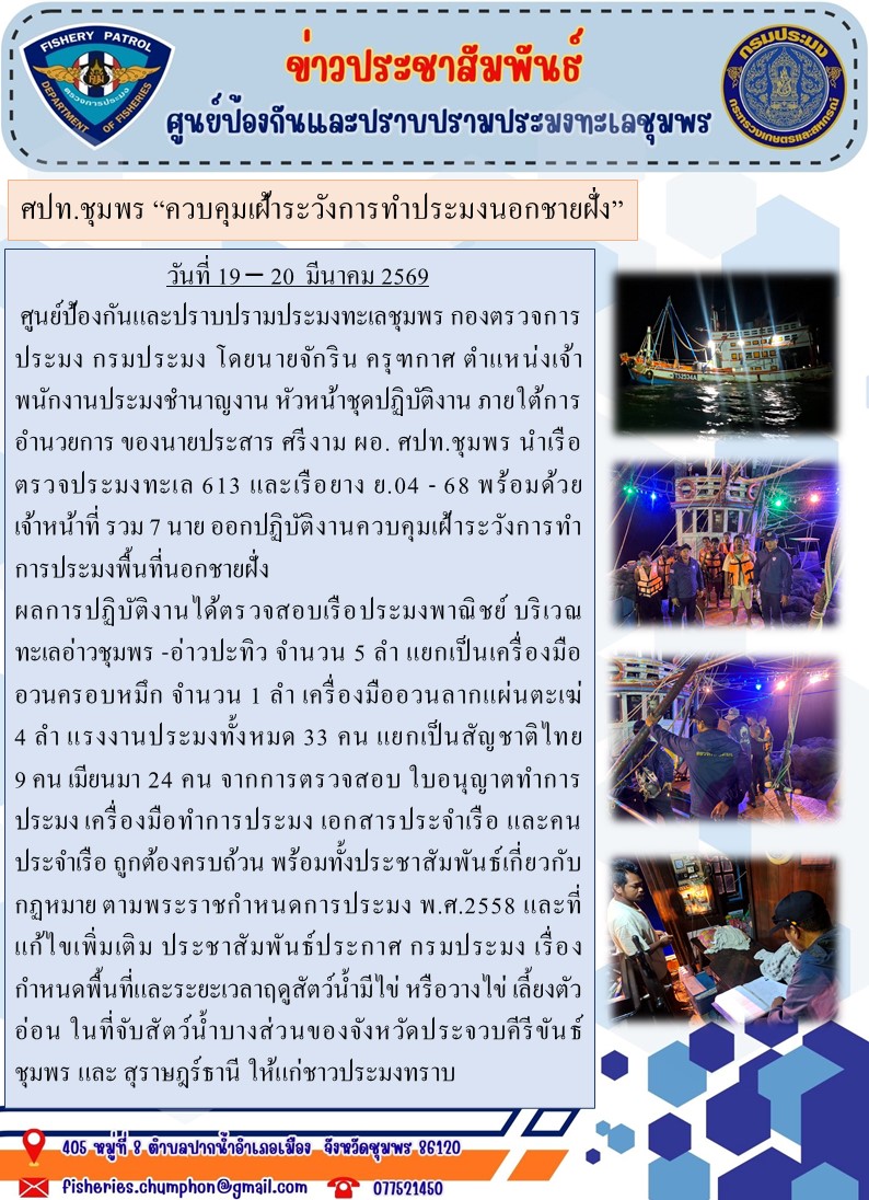 วันที่ ๑๙- ๒๐ มีนาคม ๒๕๖๙ ศูนย์ป้องกันและปราบปรามประมงทะเลชุมพร กองตรวจการประมง กรมประมง โดยนายจักริน ครุฑกาศ ตำแหน่งเจ้าพนักงานประมงชำนาญงาน หัวหน้าชุดปฏิบัติงาน ภายใต้การอำนวยการ ของนายประสาร ศรีงาม ผอ. ศปท.ชุมพร นำเรือตรวจประมงทะเล ๖๑๓ และเรือยาง ย.๐๔-๖๘ พร้อมด้วยเจ้าหน้าที่ รวม ๗ นาย ออกปฏิบัติงานควบคุมเฝ้าระวังการทำการประมงพื้นที่นอกชายฝั่ง