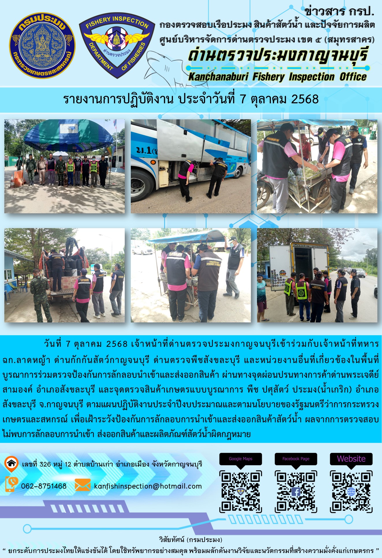 วันที่ 7 ตุลาคม 2568 เจ้าหน้าที่ด่านตรวจประมงกาญจนบุรีเข้าร่วมกับเจ้าหน้าที่ทหารหน่วยเฉพาะกิจลาดหญ้า ด่านกักกันสัตว์กาญจนบุรี ด่านตรวจพืชสังขละบุรี และหน่วยงานอื่นที่เกี่ยวข้องในพื้นที่ บูรณาการร่วมตรวจป้องกันการลักลอบนำเข้าและส่งออกสินค้า ณ จุดผ่านแดนถาวรบ้านพุน้ำร้อน อำเภอเมือง และจุดตรวจร่วมเกษตรแบบบูรณาการ (พืช ปศุสัตว์ ประมง) อำเภอสังขละบุรีจังหวัดกาญจนบุรี ตามแผนปฏิบัติงานประจำปีงบประมาณและตามนโยบายของรัฐมนตรีว่าการกระทรวงเกษตรและสหกรณ์ เพื่อเฝ้าระวังป้องกันการลักลอบการนำเข้าและส่งออกสินค้าสัตว์น้ำ ผลจากการตรวจสอบไม่พบการลักลอบการนำเข้า ส่งออกสินค้าและผลิตภัณฑ์สัตว์น้ำผิดกฎหมาย
