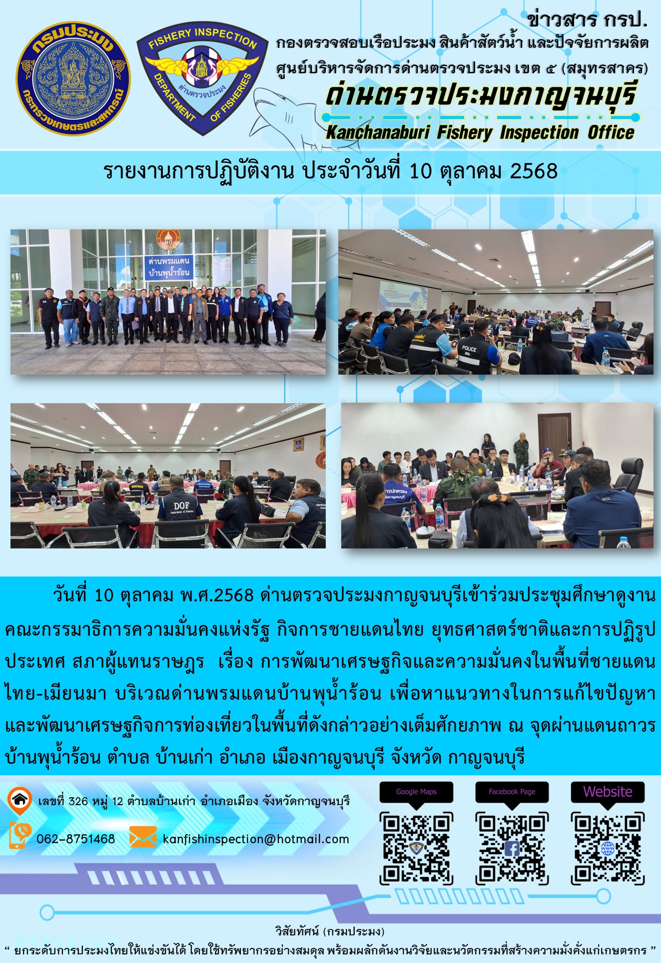 วันที่ 10 ตุลาคม พ.ศ.2568 ด่านตรวจประมงกาญจนบุรีเข้าร่วมประชุมศึกษาดูงานคณะกรรมาธิการความมั่นคงแห่งรัฐ กิจการชายแดนไทย ยุทธศาสตร์ชาติและการปฏิรูปประเทศ สภาผู้แทนราษฎร  เรื่อง การพัฒนาเศรษฐกิจและความมั่นคงในพื้นที่ชายแดนไทย-เมียนมา บริเวณด่านพรมแดนบ้านพุน้ำร้อน เพื่อหาแนวทางในการแก้ไขปัญหาและพัฒนาเศรษฐกิจการท่องเที่ยวในพื้นที่ดังกล่าวอย่างเต็มศักยภาพ ณ จุดผ่านแดนถาวรบ้านพุน้ำร้อน ตำบล บ้านเก่า อำเภอ เมืองกาญจนบุรี จังหวัด กาญจนบุรี