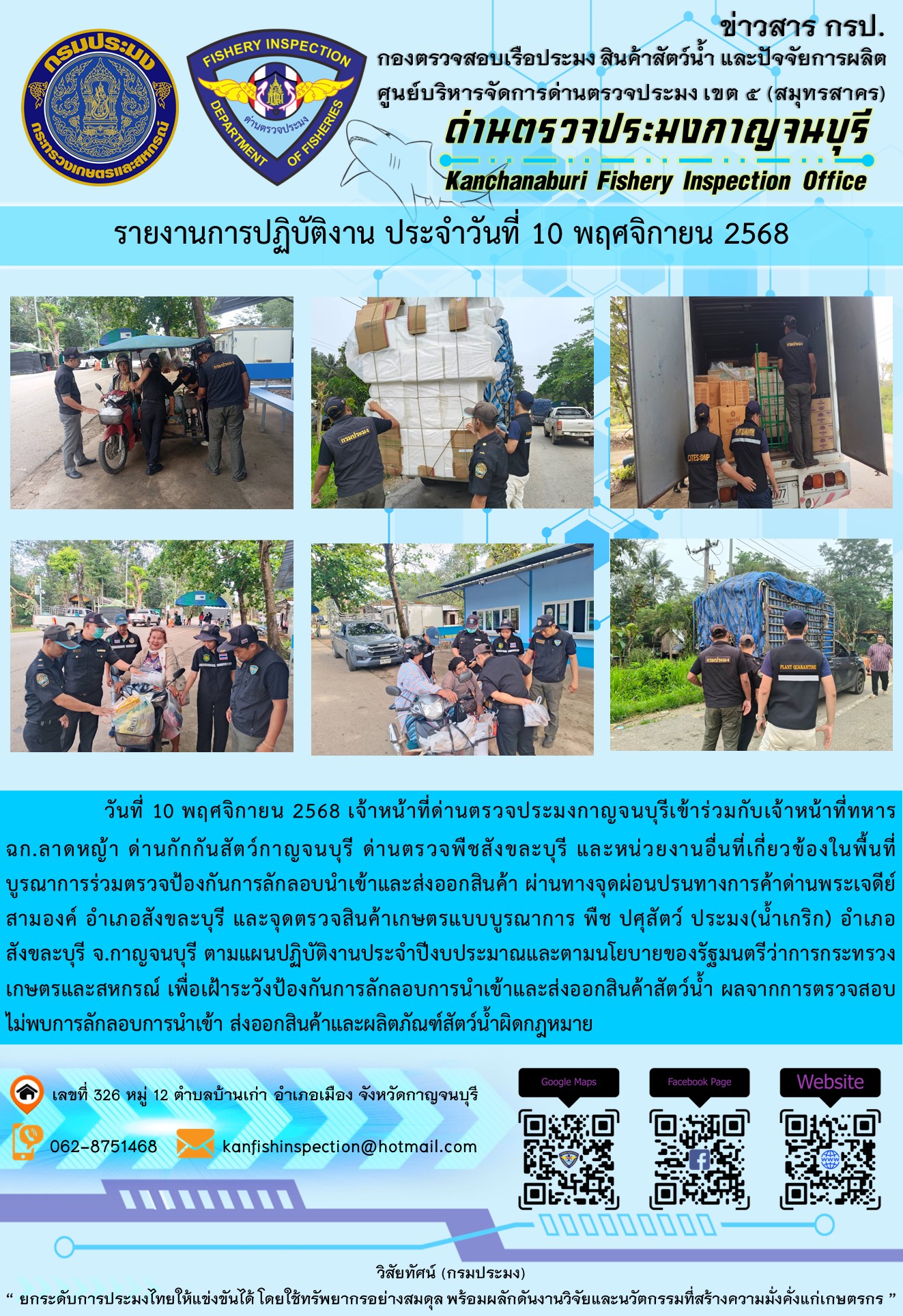 วันที่ 10 พฤศจิกายน 2568 เจ้าหน้าที่ด่านตรวจประมงกาญจนบุรีเข้าร่วมกับเจ้าหน้าที่ทหารหน่วยเฉพาะกิจลาดหญ้า ด่านกักกันสัตว์กาญจนบุรี ด่านตรวจพืชสังขละบุรี และหน่วยงานอื่นที่เกี่ยวข้องในพื้นที่ บูรณาการร่วมตรวจป้องกันการลักลอบนำเข้าและส่งออกสินค้า ณ จุดผ่านแดนถาวรบ้านพุน้ำร้อน อำเภอเมือง และจุดตรวจร่วมเกษตรแบบบูรณาการ (พืช ปศุสัตว์ ประมง) อำเภอสังขละบุรีจังหวัดกาญจนบุรี ตามแผนปฏิบัติงานประจำปีงบประมาณและตามนโยบายของรัฐมนตรีว่าการกระทรวงเกษตรและสหกรณ์ เพื่อเฝ้าระวังป้องกันการลักลอบการนำเข้าและส่งออกสินค้าสัตว์น้ำ ผลจากการตรวจสอบไม่พบการลักลอบการนำเข้า ส่งออกสินค้าและผลิตภัณฑ์สัตว์น้ำผิดกฎหมาย