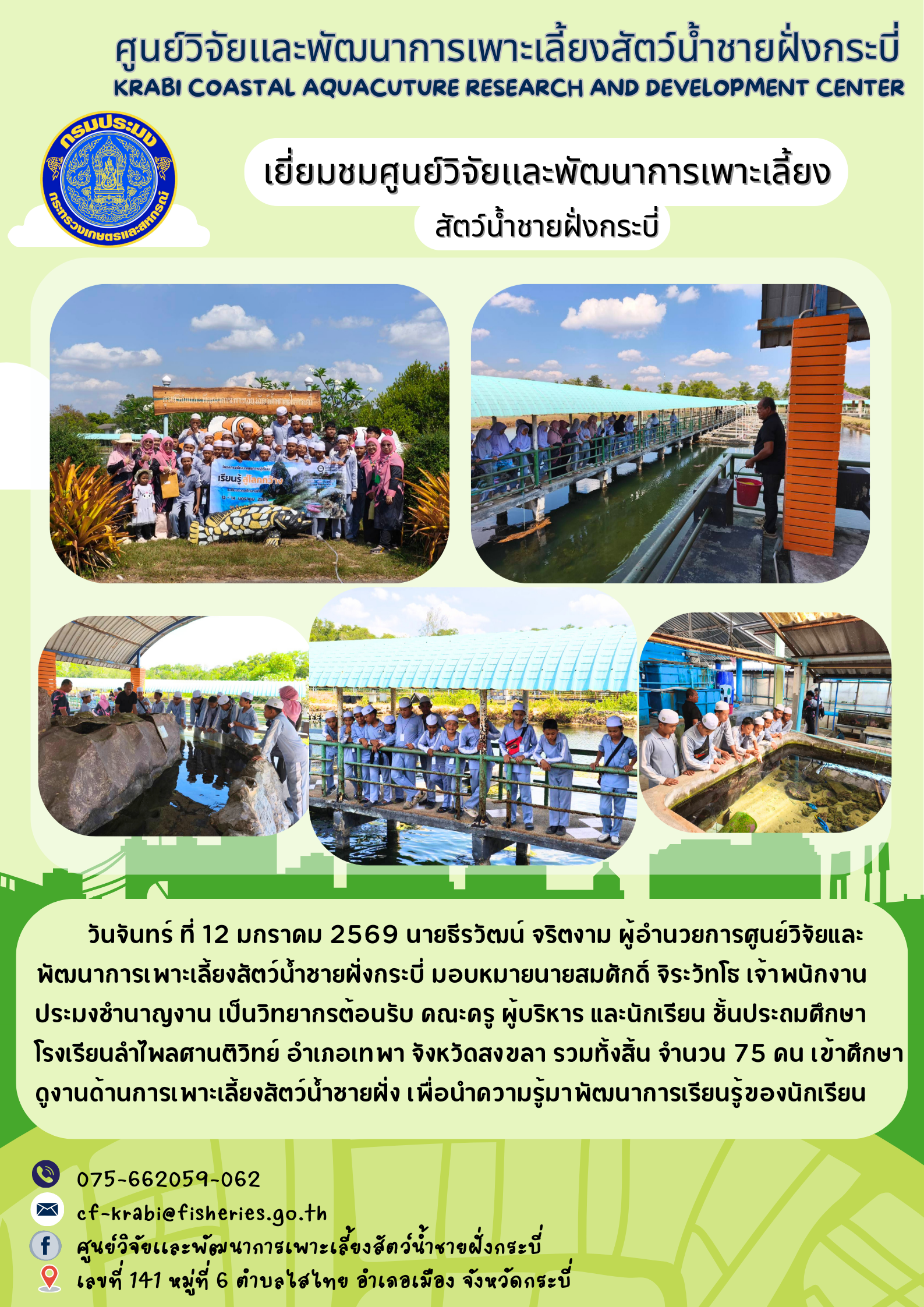 นักเรียน โรงเรียนลำไพลศานติวิทย์ อำเภอเทพา จังหวัดสงขลา เข้าศึกษาดูงานด้านการเพาะเลี้ยงสัตว์น้ำชายฝั่ง