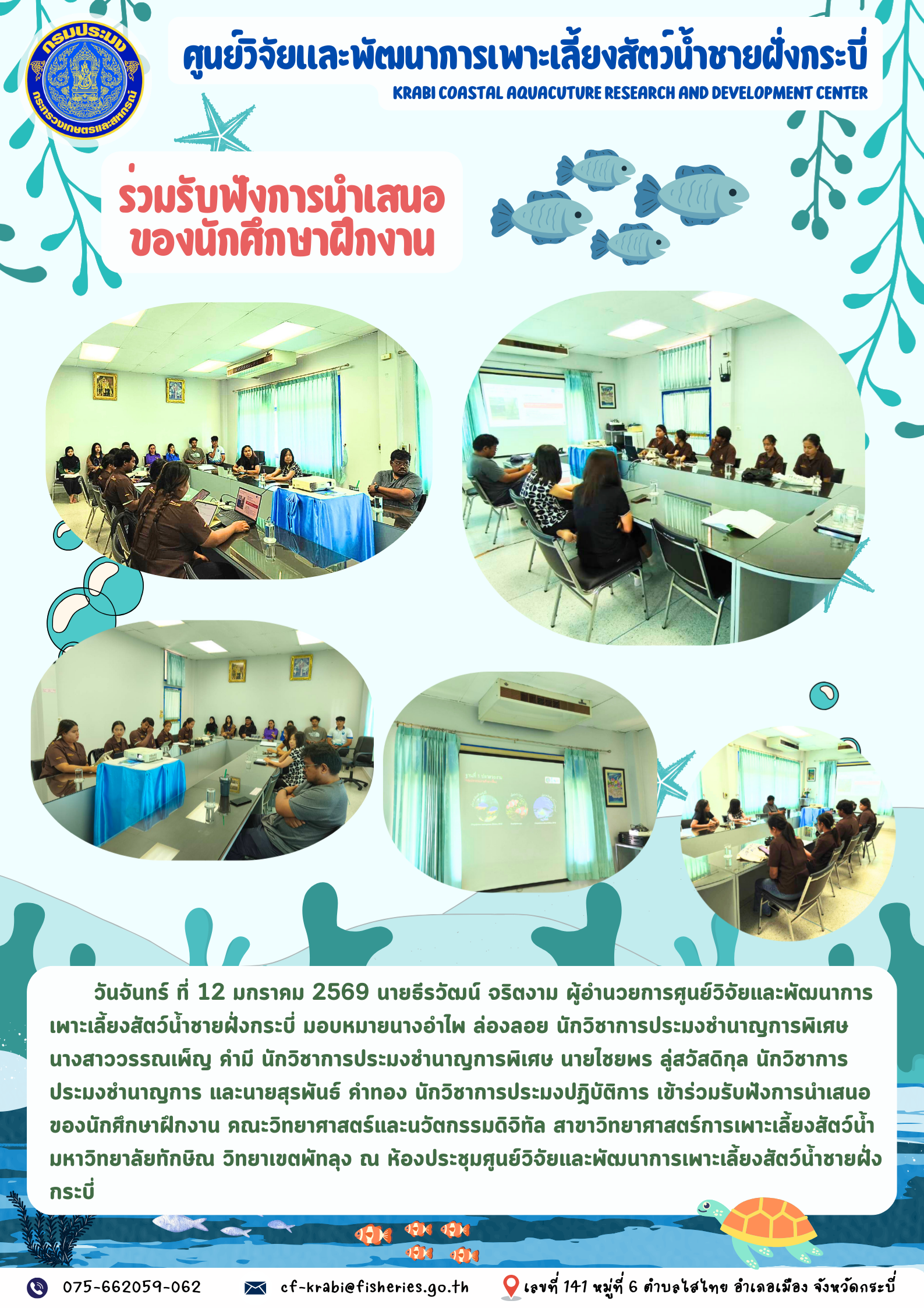 ร่วมรับฟังการนำเสนอของนักศึกษาฝึกงาน คณะวิทยาศาสตร์และนวัตกรรมดิจิทัล สาขาวิทยาศาสตร์การเพาะเลี้ยงสัตว์น้ำ มหาวิทยาลัยทักษิณ วิทยาเขตพัทลุง