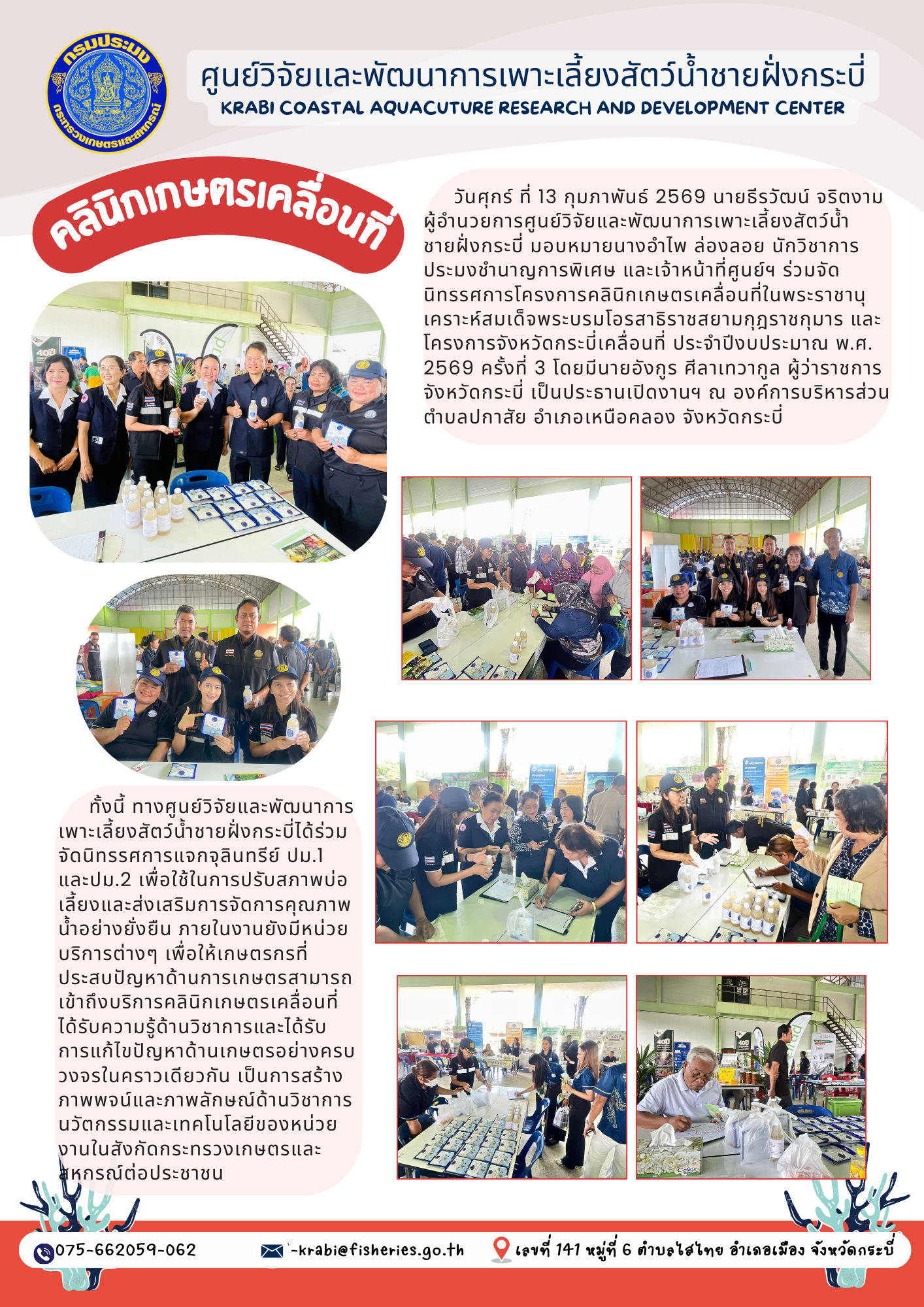 วันศุกร์ ที่ 13 กุมภาพันธ์ 2569 นายธีรวัฒน์ จริตงาม ผู้อำนวยการศูนย์วิจัยและพัฒนาการเพาะเลี้ยงสัตว์น้ำชายฝั่งกระบี่ มอบหมายนางอำไพ ล่องลอย นักวิชาการประมงชำนาญการพิเศษ และเจ้าหน้าที่ศูนย์ฯ ร่วมจัดนิทรรศการโครงการคลินิกเกษตรเคลื่อนที่ในพระราชานุเคราะห์สมเด็จพระบรมโอรสาธิราชสยามกุฎราชกุมาร และโครงการจังหวัดกระบี่เคลื่อนที่ ประจำปีงบประมาณ พ.ศ. 2569 ครั้งที่ 3 โดยมีนายอังกูร ศีลาเทวากูล ผู้ว่าราชการจังหวัดกระบี่ เป็นประธานเปิดงานฯ ณ องค์การบริหารส่วนตำบลปกาสัย อำเภอเหนือคลอง จังหวัดกระบี่