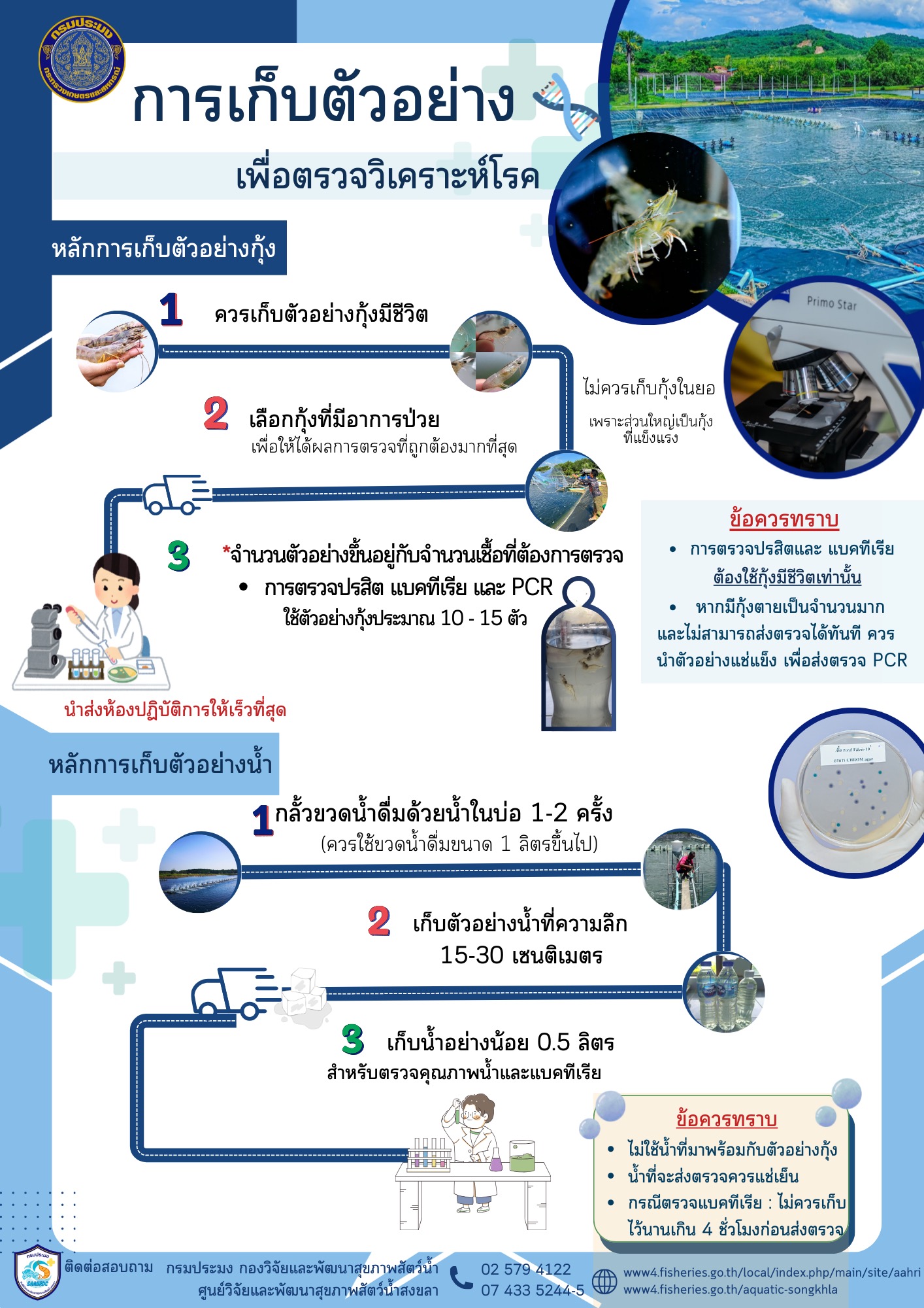 [2026-03-17] เข้าร่วมชุดปฏิบัติการเฉพาะกิจควบคุมและบังคับใช้กฏหมายภายใต้มาตรา 64 แล.. [2026-03-17] วันที่ 19 - 20 มีนาคม 2569 นี้ Mobile Clinic คลินิกสุขภาพสัตว์น้ำเคลื่.. [2026-03-17] ขอเชิญชวนเกษตรกรผู้เลี้ยงกุ้งทะเลสมัครเข้าร่วมโครงการยกระดับสินค้าเกษต.. [2026-03-16] โครงการฝึกอบรมเชิงปฏิบัติการ หลักสูตร Next Coastal Aquaculture Resear.. [2026-03-16] เข้าร่วมอบรมเชิงปฏิบัติการ การพัฒนาศักยภาพผู้ตรวจประเมินมาตรฐานฟาร์มเพ.. [2026-02-17] ต้อนรับคณะครู ผู้บริหาร และนักเรียน ชั้นประถมศึกษาปีที่ 1-6 โรงเรียนบ้.. [2026-02-17] กิจกรรมโครงการคลินิกเกษตรเคลื่อนที่.. [2026-02-10] เชิญชวนสมัครเข้าร่วมโครงการยกระดับเกษตรมูลค่าสูง.. [2026-01-26] ร่วมรับฟังการนำเสนอของนักศึกษาฝึกสหกิจศึกษา คณะวิทยาศาสตร์ สาขาวิทยาศา.. [2026-01-14] ร่วมรับฟังการนำเสนอของนักศึกษาฝึกงาน คณะวิทยาศาสตร์และนวัตกรรมดิจิทัล.. อ่านทั้งหมด