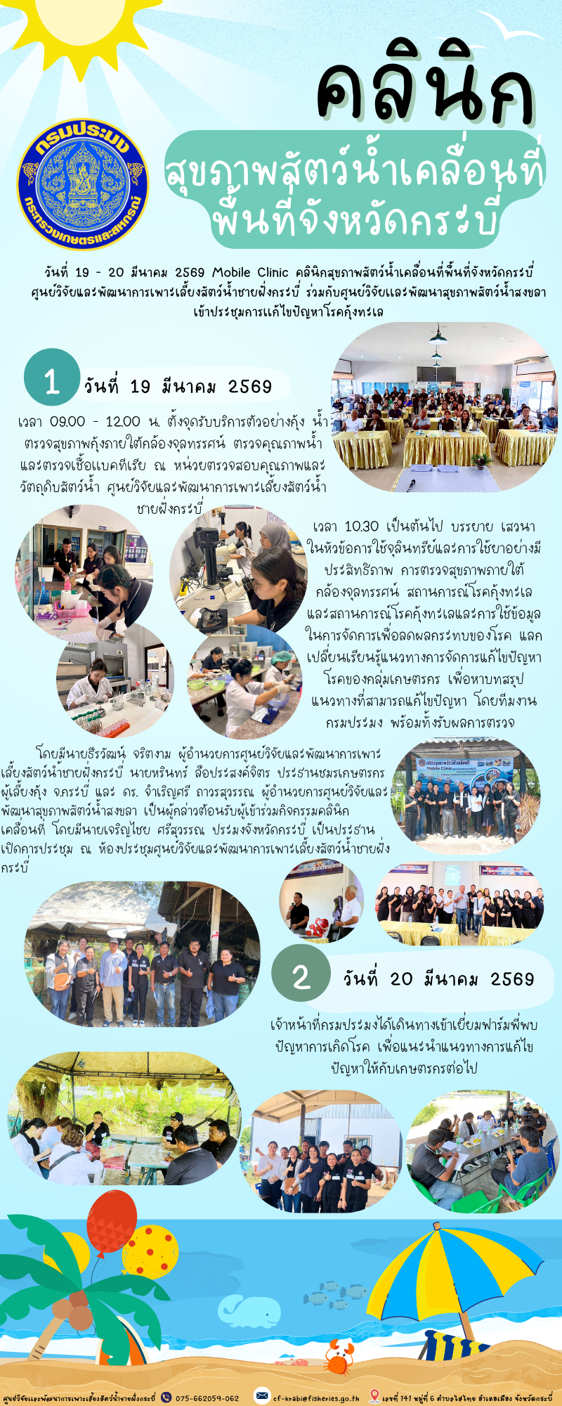 วันที่ 19 - 20 มีนาคม 2569 Mobile Clinic คลินิกสุขภาพสัตว์น้ำเคลื่อนที่พื้นที่จังหวัดกระบี่ ศูนย์วิจัยและพัฒนาการเพาะเลี้ยงสัตว์น้ำชายฝั่งกระบี่ ร่วมกับศูนย์วิจัยเเละพัฒนาสุขภาพสัตว์น้ำสงขลา เข้าประชุมการเเก้ไขปัญหาโรคกุ้งทะเล รายละเอียดดังนี้