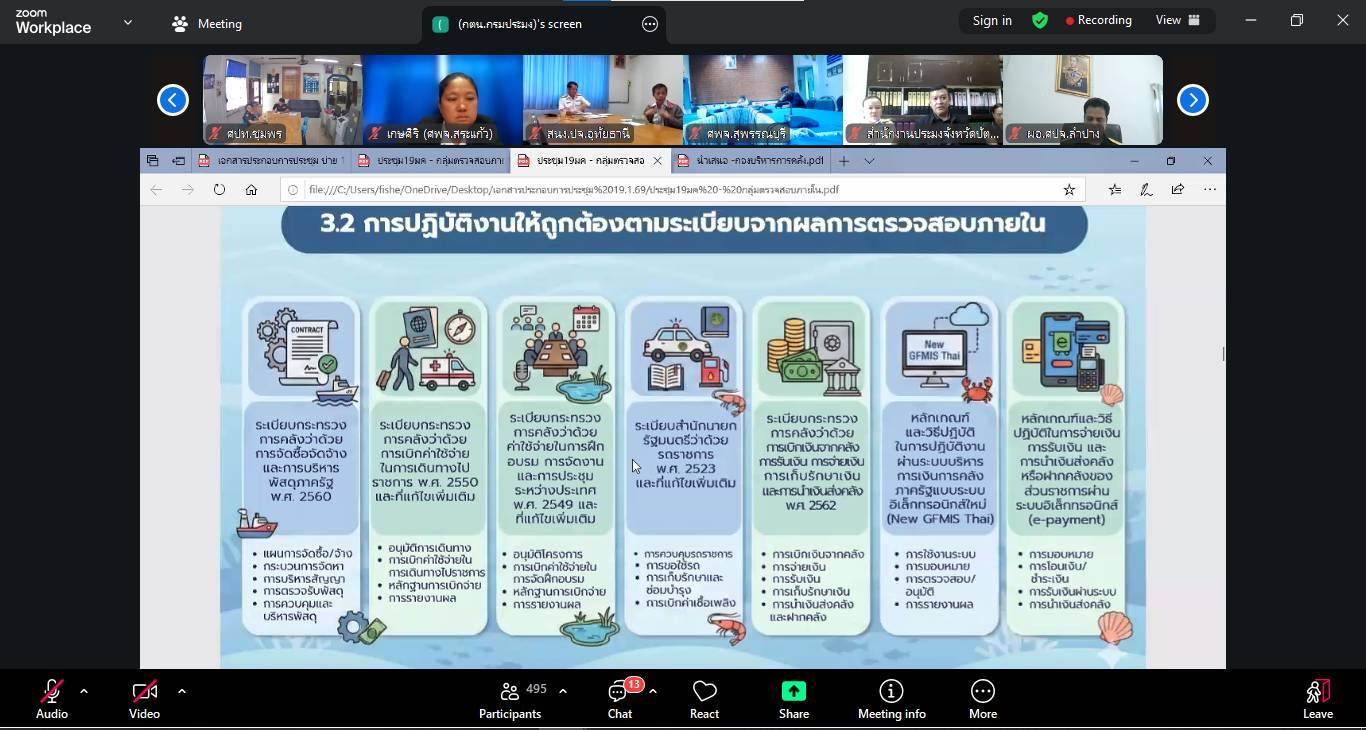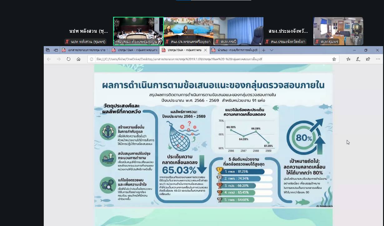 วันที่ 19 มกราคม 2569 หน่วยป้องกันและปราบปรามประมงทะเลหลังสวน (ชุมพร) ศูนย์ป้องกันและปราบปรามประมงทะเลชุมพร กองตรวจการประมง กรมประมง โดยนายนุรัตน์ ขาวสอาด หัวหน้า นปท.หลังสวน (ชุมพร) มอบหมายให้เจ้าหน้าที่หน่วยฯ เข้าร่วมประชุมซักซ้อมแนวทางการปฏิบัติงานให้ถูกต้องตามระเบียบ ณ.ห้องประชุมกุลาดำ ชั้น 7 อาคารจุฬาภร์ กรมประมง หรือด้วยระบบ Video Conference ผ่านโปรแกรม Zoom Meeting