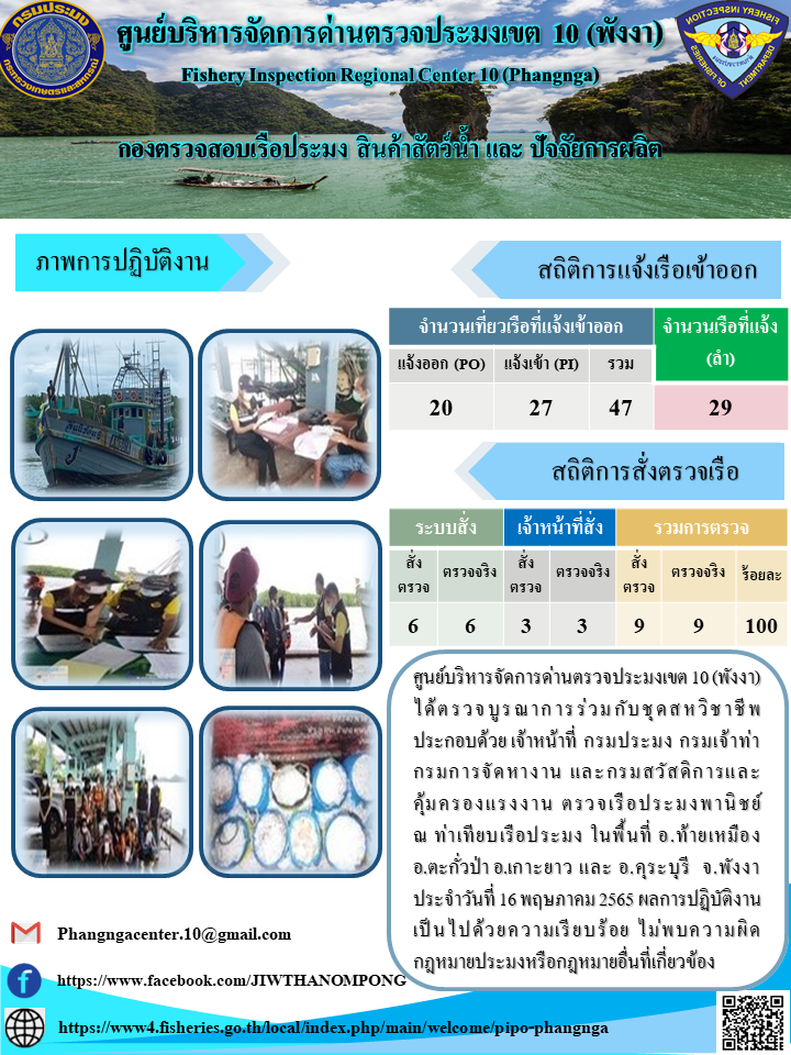 ข่าวประชาสัมพันธ์กิจกรรมการตรวจเรือประมงพาณิชย์แจ้งเข้า - ออก วันที่ 16 พฤษภาคม 2565