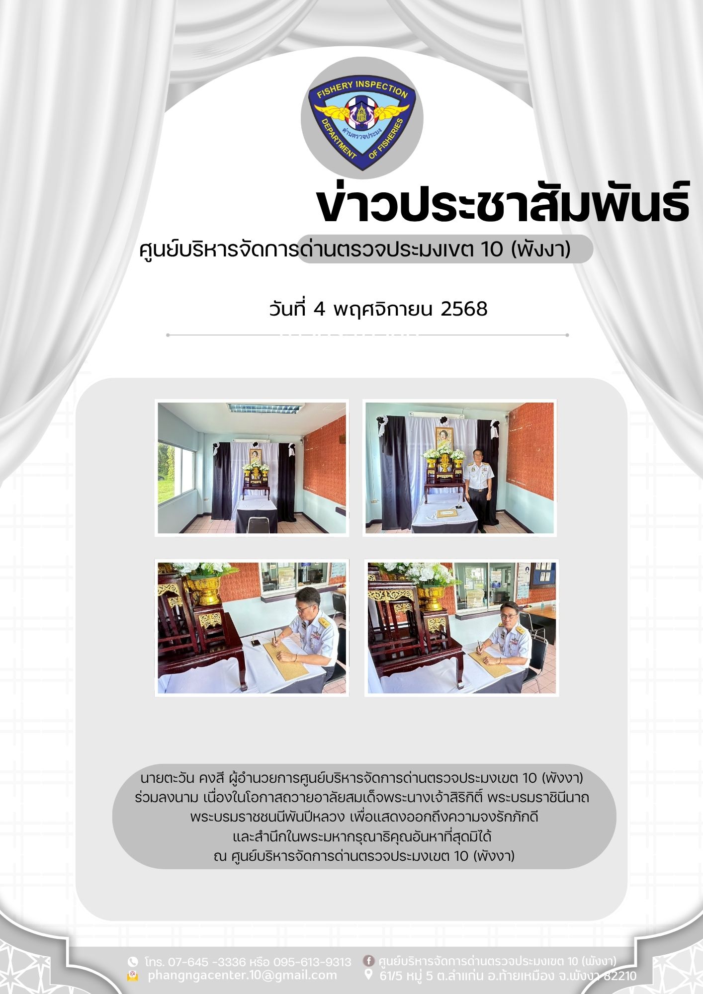 [2025-11-05] ร่วมลงนาม เนื่องในโอกาสถวายอาลัยสมเด็จพระนางเจ้าสิริกิติ์ พระบรมราชินี.. [2025-11-05] ประชุมติดตามการปฏิบัติงานร่วมกันกับศูนย์ควบคุมการแจ้งเรือเข้าออก ในพื้.. [2025-11-05] ข่าวประชาสัมพันธ์กิจกรรมการตรวจเรือประมงพาณิชย์แจ้งเข้า - ออก วันที่ 4.. [2025-11-05] ข่าวประชาสัมพันธ์กิจกรรมการตรวจเรือประมงพาณิชย์แจ้งเข้า - ออก วันที่ 3.. [2025-11-05] ข่าวประชาสัมพันธ์กิจกรรมการตรวจเรือประมงพาณิชย์แจ้งเข้า - ออก วันที่ 2.. [2025-11-04] ข่าวประชาสัมพันธ์กิจกรรมการตรวจเรือประมงพาณิชย์แจ้งเข้า - ออก วันที่ 1.. [2025-11-03] ข่าวประชาสัมพันธ์กิจกรรมการตรวจเรือประมงพาณิชย์แจ้งเข้า - ออก วันที่ 3.. [2025-10-31] ข่าวประชาสัมพันธ์กิจกรรมการตรวจเรือประมงพาณิชย์แจ้งเข้า - ออก วันที่ 3.. [2025-10-31] ข่าวประชาสัมพันธ์กิจกรรมการตรวจเรือประมงพาณิชย์แจ้งเข้า - ออก วันที่ 2.. [2025-10-29] ร่วมต้อนรับ รัฐมนตรีช่วยว่าการกระทรวงเกษตรและสหกรณ์ และคณะในพื้นที่จัง.. อ่านทั้งหมด