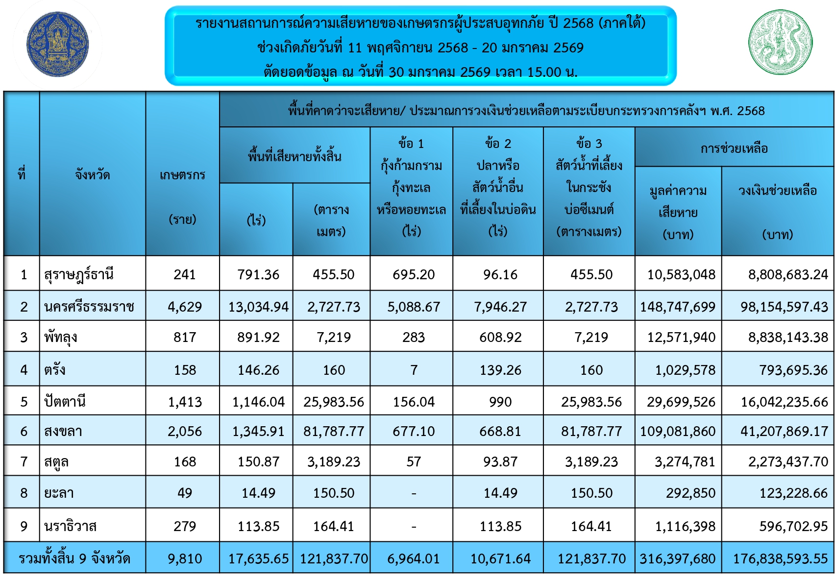 รายงานสถานการณ์ความเสียหายของเกษตรกรผู้ประสบอุทกภัย ปี 2568 ตัดยอดข้อมูล ณ วันที่ 30 มกราคม 2569