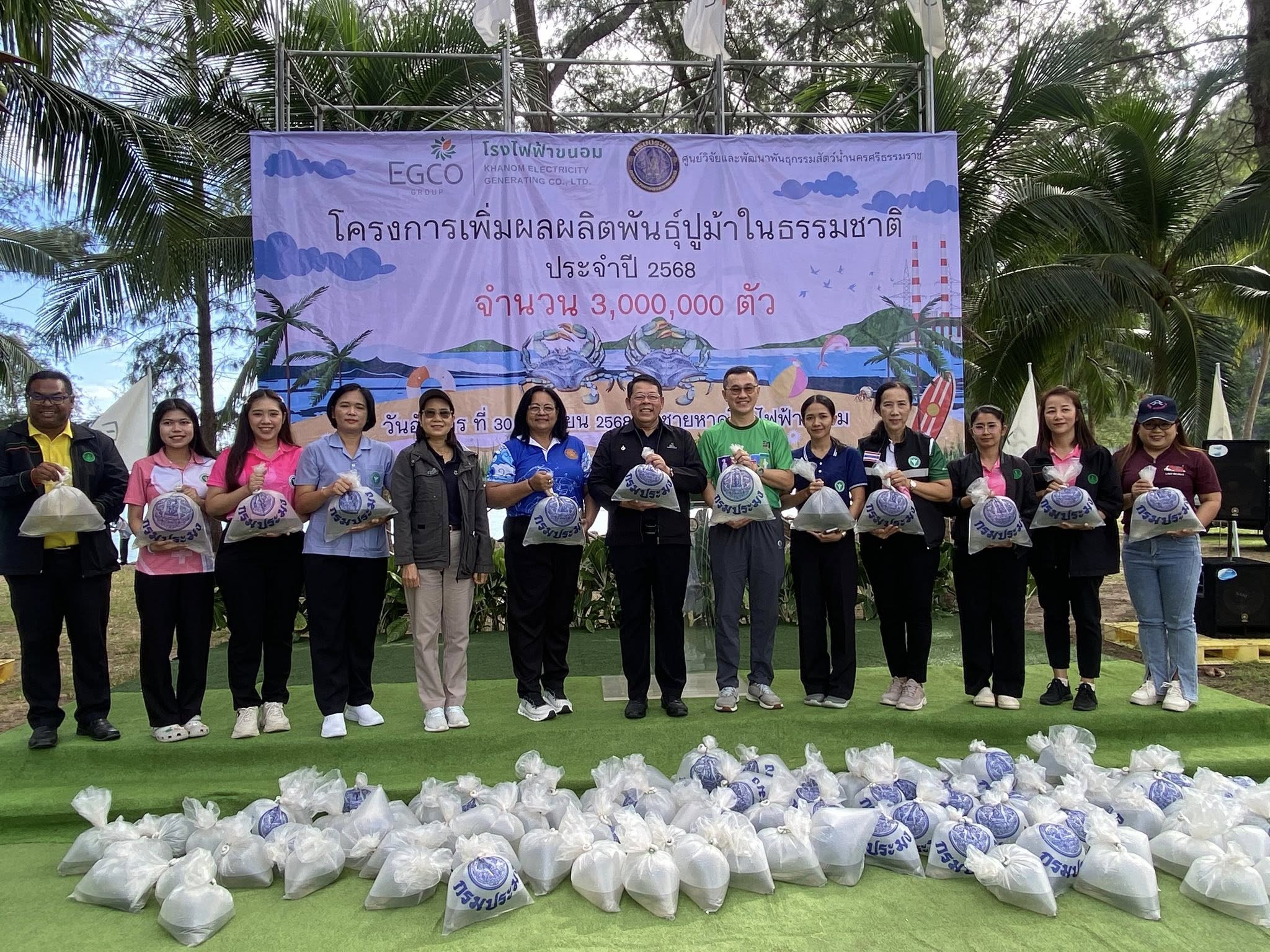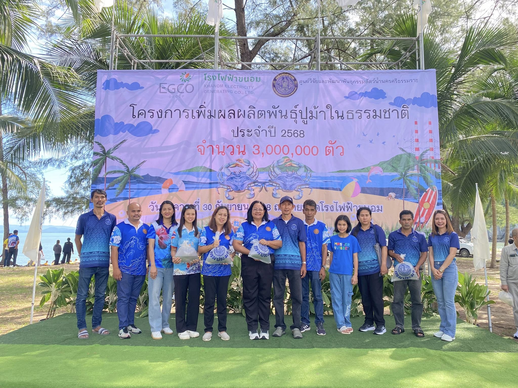 วันที่ ๓๐ กันยายน ๒๕๖๘ นางสิริวรรณ หนูเซ่ง ผู้อำนวยการศูนย์วิจัยและพัฒนาพันธุกรรมสัตว์น้ำนครศรีธรรมราช พร้อมด้วยเจ้าหน้าที่ของศูนย์ฯ เข้าร่วมกิจกรรม “โครงการเพิ่มผลผลิตปูม้าในธรรมชาติ ประจำปี ๒๕๖๘ ” โดยบริษัทผลิตไฟฟ้าขนอม จำกัด จัดขึ้นเพื่อ ดูแลสิ่งแวดล้อมทรัพยากรธรรมชาติ และสร้างความยั่งยืนให้กับชุมชนและสังคม ซึ่งเป็นโครงการที่อนุรักษ์ทรัพยากรธรรมชาติและสิ่งแวดล้อม รวมทั้งส่งเสริมรายได้ให้กับชุมชนที่ประกอบอาชีพประมงชายฝั่ง และช่วยสร้างความเข้มแข็งและความยั่งยืนให้กับชุมชนตลอดไป โดยมีหัวหน้าส่วนราชการ รัฐวิสาหกิจ ผู้บริหารองค์กรปกครองส่วนท้องถิ่น กำนัน ผู้ใหญ่บ้าน ผู้นำภาคเอกชน เข้าร่วมกิจกรรมปล่อยพันธุ์ปูม้า จำนวน ๓,๐๐๐,๐๐๐ ตัว ณ บริเวณชายหาดโรงไฟฟ้าขนอม หมู่ที่ ๘ ตำบลท้องเนียน อำเภอขนอม จังหวัดนครศรีธรรมราช