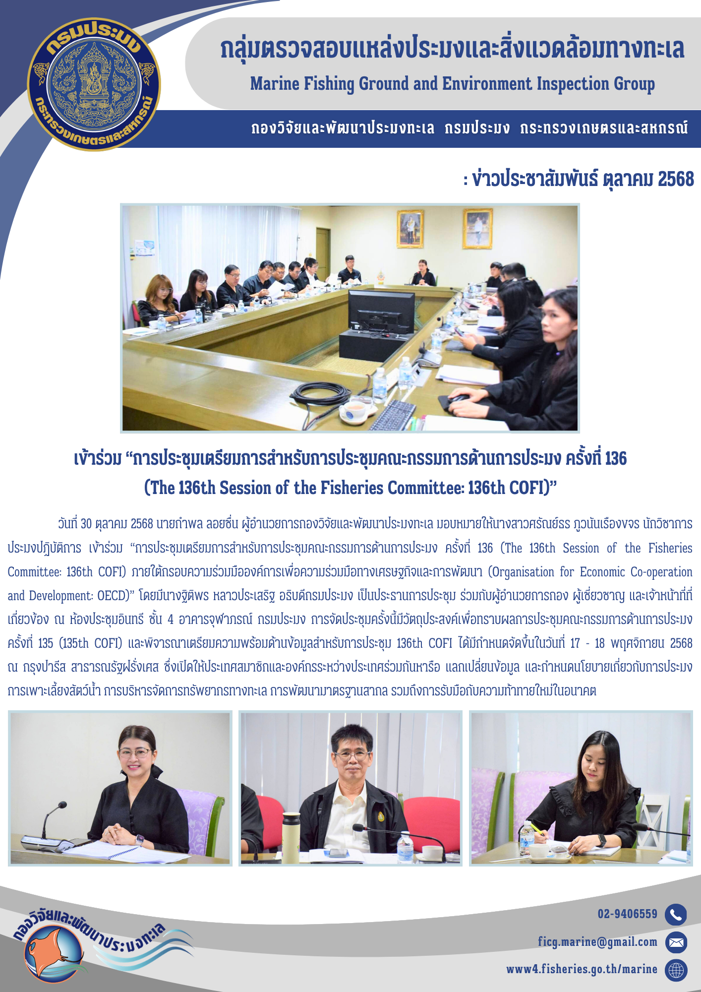 วันที่ 30 ตุลาคม 2568 นายกำพล ลอยชื่น ผู้อำนวยการกองวิจัยและพัฒนาประมงทะเล มอบหมายให้นางสาวศรัณย์ธร ภูวนันเรืองขจร นักวิชาการประมงปฏิบัติการ เข้าร่วม “การประชุมเตรียมการสำหรับการประชุมคณะกรรมการด้านการประมง ครั้งที่ 136 (The 136th Session of the Fisheries Committee: 136th COFI) ภายใต้กรอบความร่วมมือองค์การเพื่อความร่วมมือทางเศรษฐกิจและการพัฒนา (Organisation for Economic Co-operation and Development: OECD)” โดยมีนางฐิติพร หลาวประเสริฐ อธิบดีกรมประมง เป็นประธานการประชุม ร่วมกับผู้อำนวยการกอง ผู้เชี่ยวชาญ และเจ้าหน้าที่ที่เกี่ยวข้อง ณ ห้องประชุมอินทรี ชั้น 4 อาคารจุฬาภรณ์ กรมประมง การจัดประชุมครั้งนี้มีวัตถุประสงค์เพื่อทราบผลการประชุมคณะกรรมการด้านการประมง ครั้งที่ 135 (135th COFI) และพิจารณาเตรียมความพร้อมด้านข้อมูลสำหรับการประชุม 136th COFI ได้มีกำหนดจัดขึ้นในวันที่ 17 - 18 พฤศจิกายน 2568 ณ กรุงปารีส สาธารณรัฐฝรั่งเศส ซึ่งเปิดให้ประเทศสมาชิกและองค์กรระหว่างประเทศร่วมกันหารือ แลกเปลี่ยนข้อมูล และกำหนดนโยบายเกี่ยวกับการประมง การเพาะเลี้ยงสัตว์น้ำ การบริหารจัดการทรัพยากรทางทะเล การพัฒนามาตรฐานสากล รวมถึงการรับมือกับความท้าทายใหม่ในอนาคต