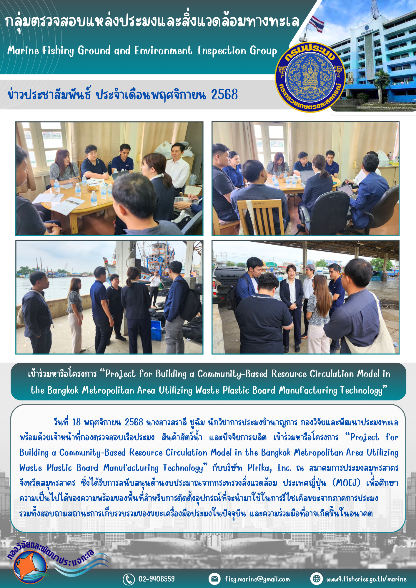 วันที่ 18 พฤศจิกายน 2568 นางสาวสราลี ชูฉิม นักวิชาการประมงชำนาญการ กองวิจัยและพัฒนาประมงทะเล พร้อมด้วยเจ้าหน้าที่กองตรวจสอบเรือประมง สินค้าสัตว์น้ำ และปัจจัยการผลิต เข้าร่วมหารือโครงการ “Project for Building a Community-Based Resource Circulation Model in the Bangkok Metropolitan Area Utilizing Waste Plastic Board Manufacturing Technology” กับบริษัท Pirika, Inc. ณ สมาคมการประมงสมุทรสาคร จังหวัดสมุทรสาคร ซึ่งได้รับการสนับสนุนด้านงบประมาณจากกระทรวงสิ่งแวดล้อม ประเทศญี่ปุ่น (MOEJ) เพื่อศึกษาความเป็นไปได้ของความพร้อมของพื้นที่สำหรับการติดตั้งอุปกรณ์ที่จะนำมาใช้ในการรีไซเคิลขยะจากภาคการประมง รวมทั้งสอบถามสถานะการเก็บรวบรวมของขยะเครื่องมือประมงในปัจจุบัน และความร่วมมือที่อาจเกิดขึ้นในอนาคต