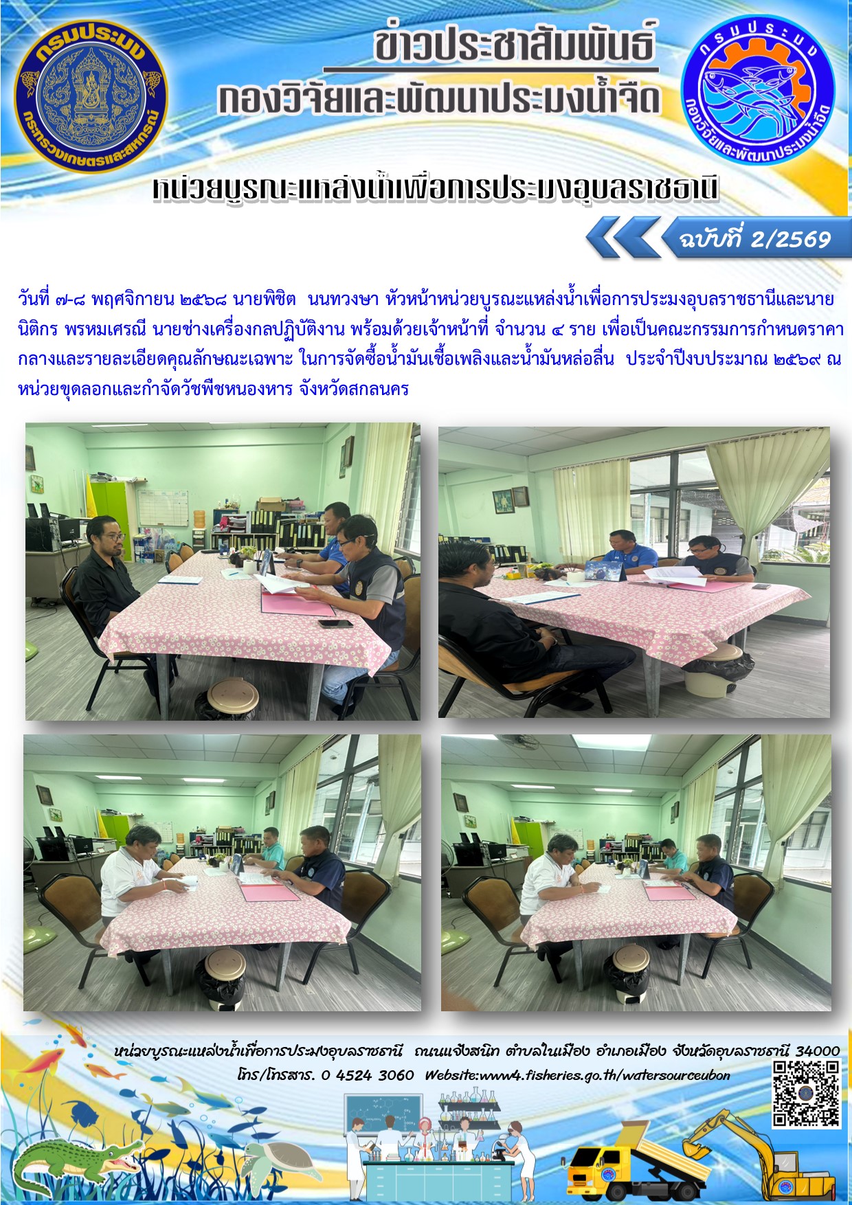 วันที่ 7-8 พฤศจิกายน 2568 นายพิชิต นนทวงษา หัวหน้าหน่วยบูรณะแหล่งน้ำเพื่อการประมงอุบลราชธานีและนายนิติกร พรหมเศรณี นายช่างเครื่องกลปฏิบัติงาน พร้อมด้วยเจ้าหน้าที่ จำนวน 4 ราย เพื่อเป็นคณะกรรมการกำหนดราคากลางและรายละเอียดคุณลักษณะเฉพาะ ในการจัดซื้อน้ำมันเชื้อเพลิงและน้ำมันหล่อลื่น ประจำปีงบประมาณ 2569 ณ หน่วยขุดลอกและกำจัดวัชพืชหนองหาร จังหวัดสกลนคร