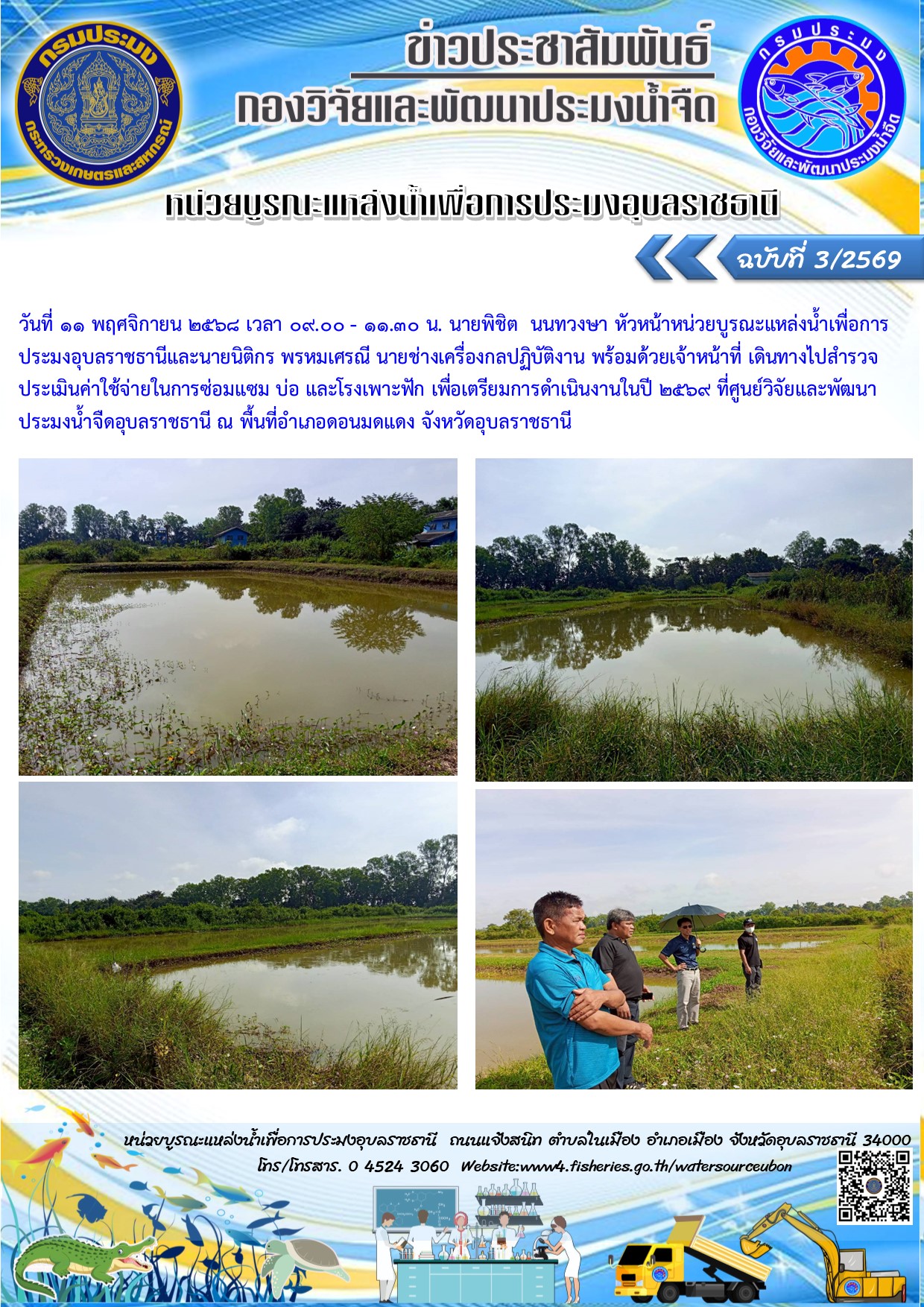วันที่ 11 พฤศจิกายน 2568 เวลา 09.00 - 11.30 น. นายพิชิต นนทวงษา หัวหน้าหน่วยบูรณะแหล่งน้ำเพื่อการประมงอุบลราชธานีและนายนิติกร พรหมเศรณี นายช่างเครื่องกลปฏิบัติงาน พร้อมด้วยเจ้าหน้าที่ เดินทางไปสำรวจประเมินค่าใช้จ่ายในการซ่อมแซม บ่อ และโรงเพาะฟัก เพื่อเตรียมการดำเนินงานในปี 2569 ที่ศูนย์วิจัยและพัฒนาประมงน้ำจืดอุบลราชธานี ณ พื้นที่อำเภอดอนมดแดง จังหวัดอุบลราชธานี