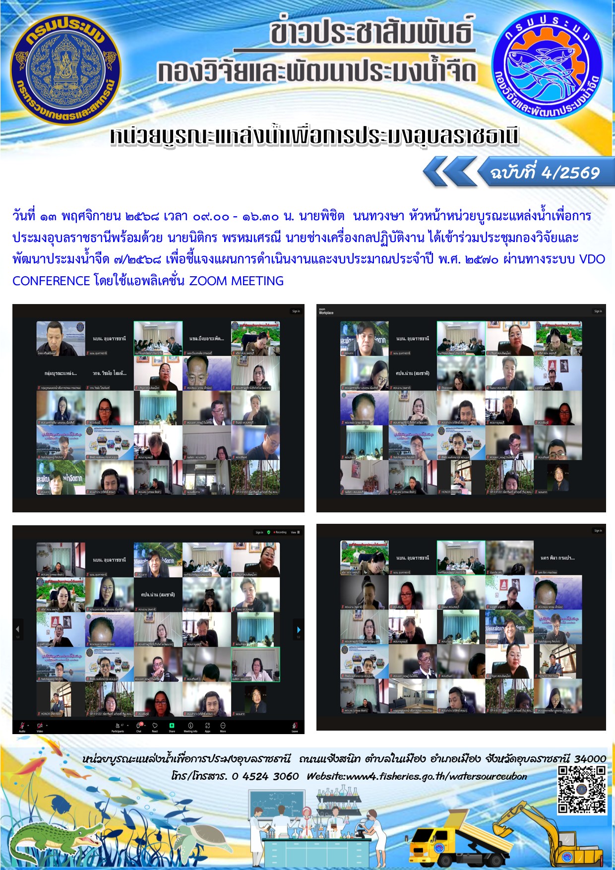 วันที่ 13 พฤศจิกายน 2568 เวลา 09.00 - 16.30 น. นายพิชิต  นนทวงษา หัวหน้าหน่วยบูรณะแหล่งน้ำเพื่อการประมงอุบลราชธานีพร้อมด้วย นายนิติกร พรหมเศรณี นายช่างเครื่องกลปฏิบัติงาน ได้เข้าร่วมประชุมกองวิจัยและพัฒนาประมงน้ำจืด 7/2568 เพื่อชี้แจงแผนการดำเนินงานและงบประมาณประจำปี พ.ศ. 2570 ผ่านทางระบบ VDO CONFERENCE โดยใช้แอพลิเคชั่น ZOOM MEETING