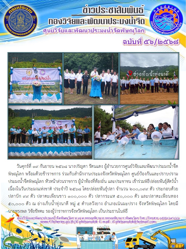 วันศุกร์ที่ 19 กันยายน 2568 นางปริญดา รัตนแดง ผู้อำนวยการศูนย์วิจัยและพัฒนาประมงน้ำจืดพิษณุโลก พร้อมด้วยข้าราชการ ร่วมกับสำนักงานประมงจังหวัดพิษณุโลก ศูนย์ป้องกันและปราบปรามประมงน้ำจืดพิษณุโลก หัวหน้าส่วนราชการ ผู้นำท้องที่ท้องถิ่น และประชาชน