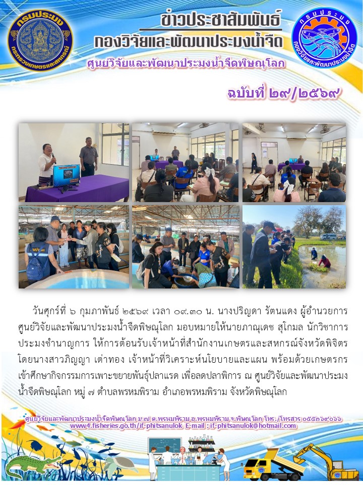 วันศุกร์ที่ 6 กุมภาพันธ์ 2569 เวลา 09.30 น. นางปริญดา รัตนแดง ผู้อำนวยการศูนย์วิจัยและพัฒนาประมงน้ำจืดพิษณุโลก มอบหมายให้นายภาณุเดช สุโกมล นักวิชาการประมงชำนาญการ