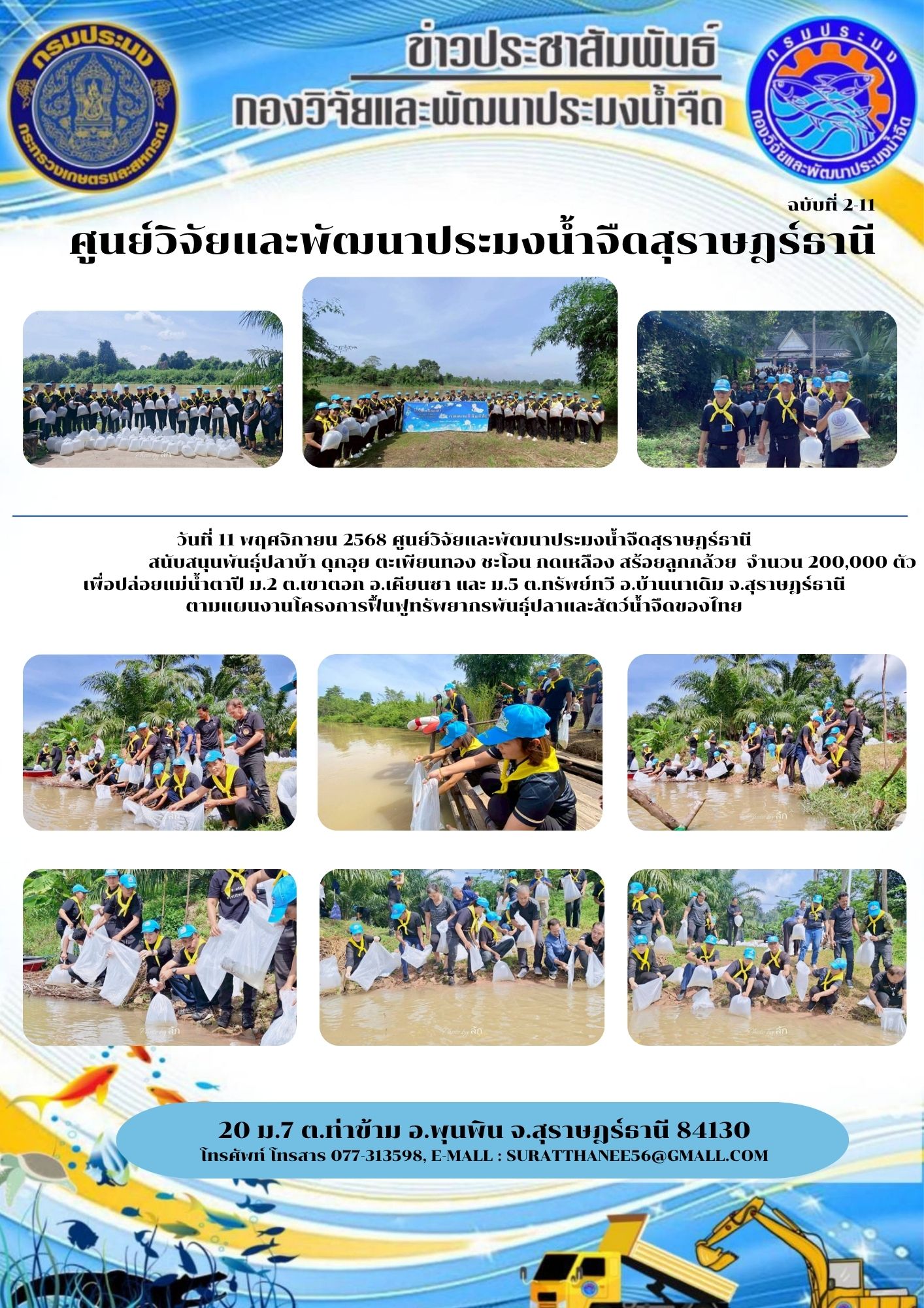วันที่ 11 พฤศจิกายน 2568 ศูนย์วิจัยและพัฒนาประมงน้ำจืดสุราษฎร์ธานี สนับสนุนพันธุ์ปลาบ้า ดุกอุย ตะเพียนทอง ชะโอน กดเหลือง สร้อยลูกกล้วย จำนวน 200,000 ตัว เพื่อปล่อยแม่น้ำตาปี ม.2 ต.เขาตอก อ.เคียนซา และ ม.5 ต.ทรัพย์ทวี อ.บ้านนาเดิม จ.สุราษฎร์ธานี ตามแผนงานโครงการฟื้นฟูทรัพยากรพันธุ์ปลาและสัตว์น้ำจืดของไทย
