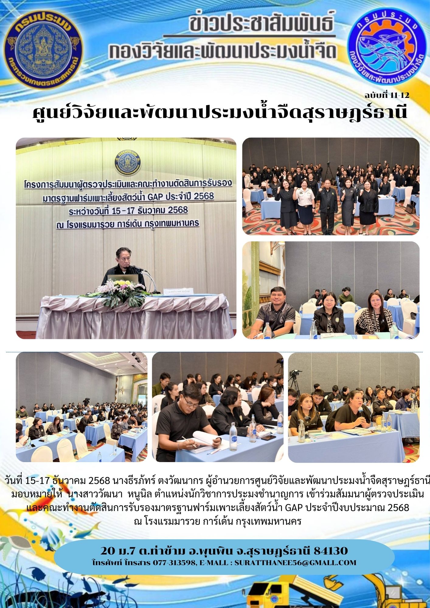 วันที่ 15-17 ธันวาคม 2568 นางธีรภ้ทร์ ตงวัฒนากร ผู้อำนวยการศูนย์วิจัยและพัฒนาประมงน้ำจืดสุราษฎร์ธานี มอบหมายให้ นางสาววัฒนา หนูนิล ตำแหน่งนักวิชาการประมงชำนาญการ เข้าร่วมสัมมนาผู้ตรวจประเมินและคณะทำงานตัดสินการรับรองมาตรฐานฟาร์มเพาะเลี้ยงสัตว์น้ำ GAP ประจำปีงบประมาณ 2568 ณ โรงแรมมารวย การ์เด้น กรุงเทพมหานคร