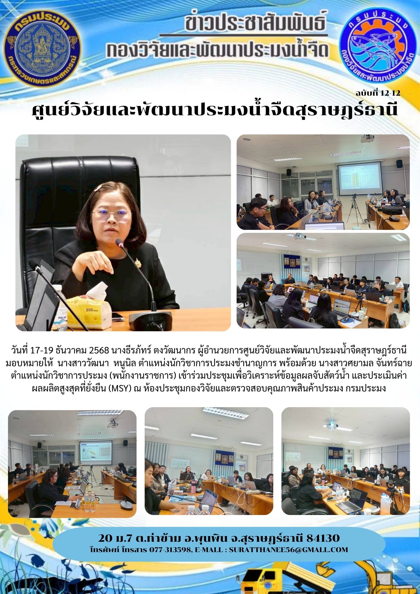 วันที่ 17-19 ธันวาคม 2568 นางธีรภ้ทร์ ตงวัฒนากร ผู้อำนวยการศูนย์วิจัยและพัฒนาประมงน้ำจืดสุราษฎร์ธานี มอบหมายให้ นางสาววัฒนา หนูนิล ตำแหน่งนักวิชาการประมงชำนาญการ พร้อมด้วย นางสาวศยามล จันทร์ฉาย ตำแหน่งนักวิชาการประมง (พนักงานราชการ) เข้าร่วมประชุมเพื่อวิเคราะห์ข้อมูลผลจับสัตว์น้ำ และประเมินค่าผลผลิตสูงสุดที่ยั่งยืน (MSY) ณ ห้องประชุมกองวิจัยและตรวจสอบคุณภาพสินค้าประมง กรมประมง