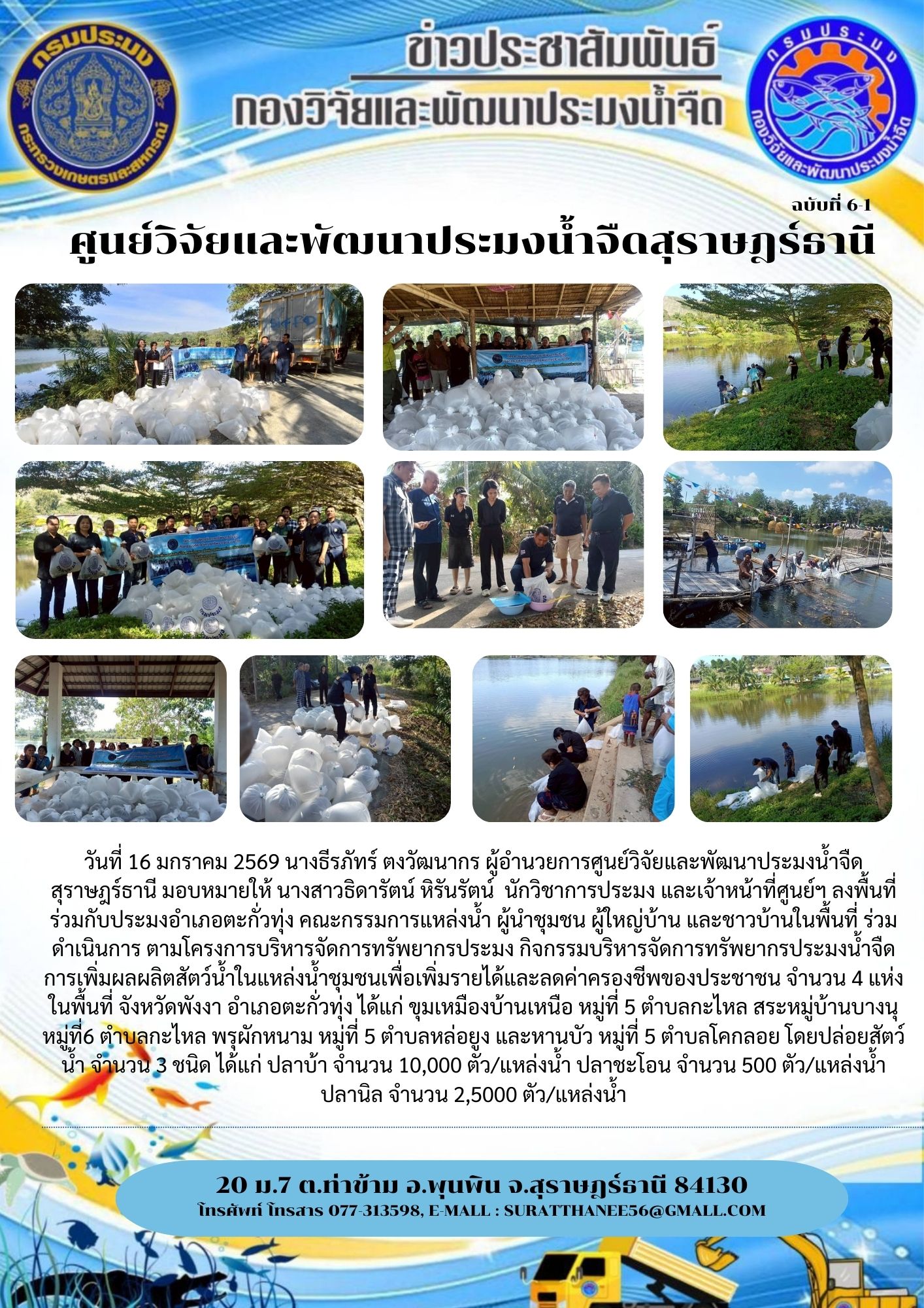 วันที่ 16 มกราคม 2569 นางธีรภัทร์ ตงวัฒนากร ผู้อำนวยการศูนย์วิจัยและพัฒนาประมงน้ำจืดสุราษฎร์ธานี มอบหมายให้ นางสาวธิดารัตน์ หิรันรัตน์ นักวิชาการประมง และเจ้าหน้าที่ศูนย์ฯ ลงพื้นที่ร่วมกับประมงอำเภอตะกั่วทุ่ง คณะกรรมการแหล่งน้ำ ผู้นำชุมชน ผู้ใหญ่บ้าน และชาวบ้านในพื้นที่ ร่วมดำเนินการ ตามโครงการบริหารจัดการทรัพยากรประมง กิจกรรมบริหารจัดการทรัพยากรประมงน้ำจืด การเพิ่มผลผลิตสัตว์น้ำในแหล่งน้ำชุมชนเพื่อเพิ่มรายได้และลดค่าครองชีพของประชาชน
