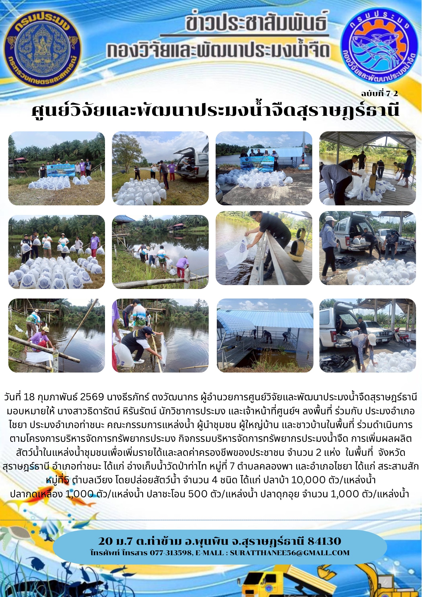 วันที่ 18 กุมภาพันธ์ 2569 นางธีรภัทร์ ตงวัฒนากร ผู้อำนวยการศูนย์วิจัยและพัฒนาประมงน้ำจืดสุราษฎร์ธานี มอบหมายให้ นางสาวธิดารัตน์ หิรันรัตน์ นักวิชาการประมง และเจ้าหน้าที่ศูนย์ฯ ลงพื้นที่ ร่วมกับ ประมงอำเภอไชยา ประมงอำเภอท่าชนะ คณะกรรมการแหล่งน้ำ ผู้นำชุมชน ผู้ใหญ่บ้าน และชาวบ้านในพื้นที่ ร่วมดำเนินการ ตามโครงการบริหารจัดการทรัพยากรประมง กิจกรรมบริหารจัดการทรัพยากรประมงน้ำจืด การเพิ่มผลผลิตสัตว์น้ำในแหล่งน้ำชุมชนเพื่อเพิ่มรายได้และลดค่าครองชีพของประชาชน จำนวน 2 แห่ง ในพื้นที่ จังหวัดสุราษฎร์ธานี