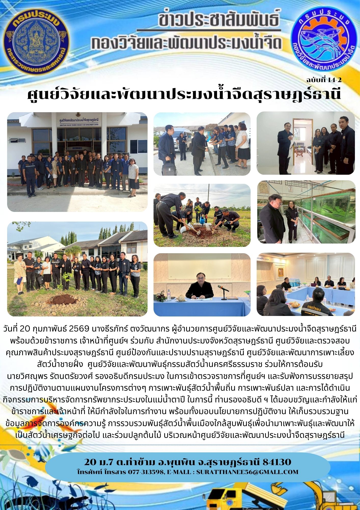 วันที่ 20 กุมภาพันธ์ 2569 นางธีรภัทร์ ตงวัฒนากร ผู้อำนวยการศูนย์วิจัยและพัฒนาประมงน้ำจืดสุราษฎร์ธานี พร้อมด้วยข้าราชการ เจ้าหน้าที่ศูนย์ฯ ร่วมกับ สำนักงานประมงจังหวัดสุราษฎร์ธานี ศูนย์วิจัยและตรวจสอบคุณภาพสินค้าประมงสุราษฎร์ธานี ศูนย์ป้องกันและปราบปรามสุราษฎร์ธานี ศูนย์วิจัยและพัฒนาการเพาะเลี้ยงสัตว์น้ำชายฝั่ง ศูนย์วิจัยและพัฒนาพันธุ์กรรมสัตว์น้ำนครศรีธรรมราช ร่วมให้การต้อนรับ นายวิศณุพร รัตนตรัยวงศ์ รองอธิบดีกรมประมง ในการเข้าตรวจราชการที่ศูนย์ฯ และรับฟังการบรรยายสรุปการปฏิบัติงานตามแผนงานโครงการต่างๆ การเพาะพันธุ์สัตว์น้ำพื้นถิ่น การเพาะพันธ์ปลา และการได้ดำเนินกิจกรรมการบริหารจัดการทรัพยากระประมงในแม่น้ำตาปี ในการนี้ ท่านรองอธิบดี ฯ ได้มอบขวัญและกำลังให้แก่ข้าราชการและเจ้าหน้าที่ ให้มีกำลังใจในการทำงาน พร้อมทั้งมอบนโยบายการปฏิบัติงาน ให้เก็บรวบรวมฐานข้อมูลการจัดการองค์กรความรู้ การรวบรวมพันธุ์สัตว์น้ำพื้นเมืองใกล้สูบพันธุ์เพื่อนำมาเพาะพันธุ์และพัฒนาให้เป็นสัตว์น้ำเศรษฐกิจต่อไป และร่วมปลูกต้นไม้ บริเวณหน้าศูนย์วิจัยและพัฒนาประมงน้ำจืดสุราษฎร์ธานีวันที่