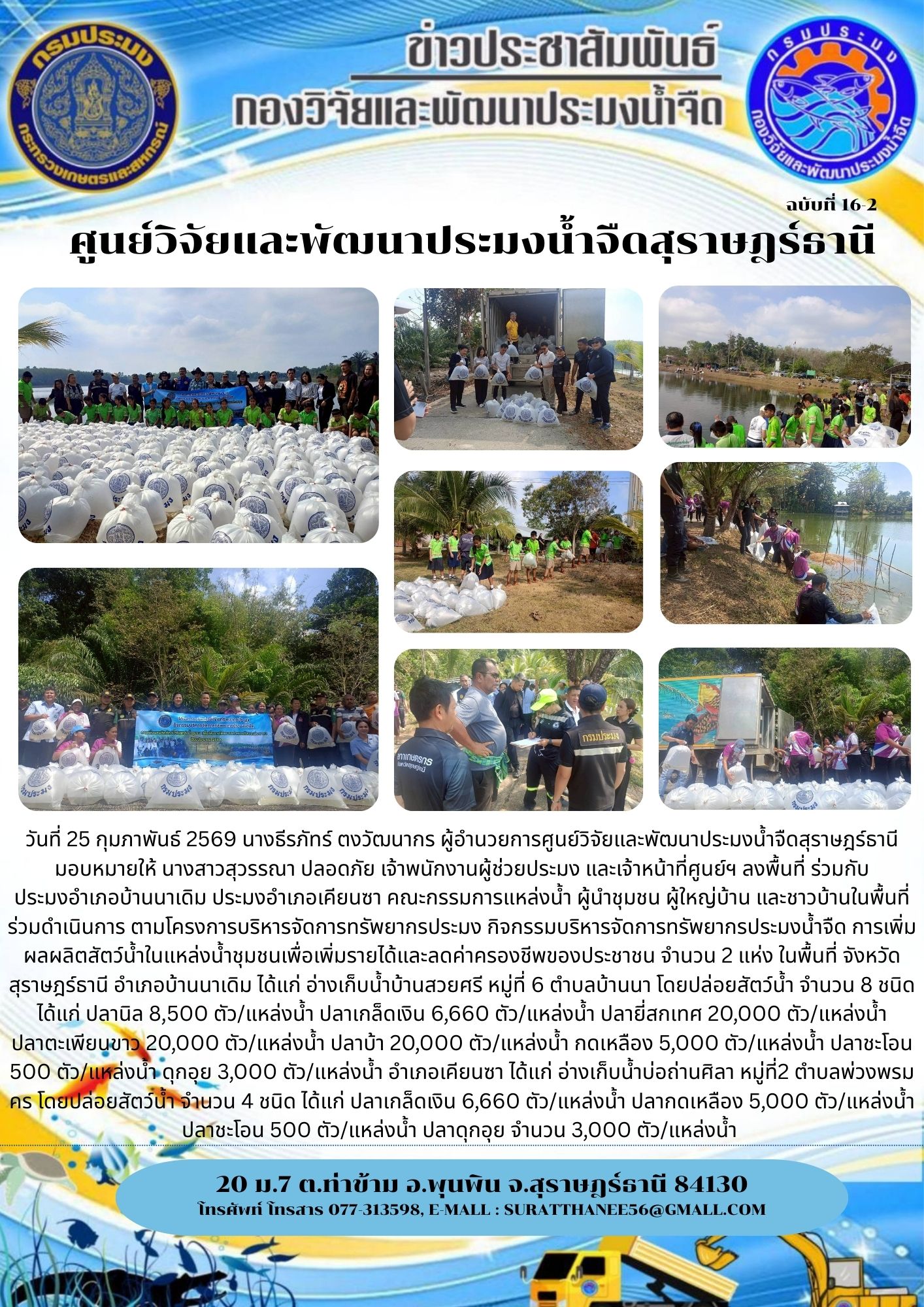 วันที่ 25 กุมภาพันธ์ 2569 นางธีรภัทร์ ตงวัฒนากร ผู้อำนวยการศูนย์วิจัยและพัฒนาประมงน้ำจืดสุราษฎร์ธานี มอบหมายให้ นางสาวสุวรรณา ปลอดภัย เจ้าพนักงานผู้ช่วยประมง และเจ้าหน้าที่ศูนย์ฯ ลงพื้นที่ ร่วมกับ ประมงอำเภอบ้านนาเดิม ประมงอำเภอเคียนซา คณะกรรมการแหล่งน้ำ ผู้นำชุมชน ผู้ใหญ่บ้าน และชาวบ้านในพื้นที่ ร่วมดำเนินการ ตามโครงการบริหารจัดการทรัพยากรประมง กิจกรรมบริหารจัดการทรัพยากรประมงน้ำจืด การเพิ่มผลผลิตสัตว์น้ำในแหล่งน้ำชุมชนเพื่อเพิ่มรายได้และลดค่าครองชีพของประชาชน จำนวน 2 แห่ง ในพื้นที่ จังหวัดสุราษฎร์ธานี
