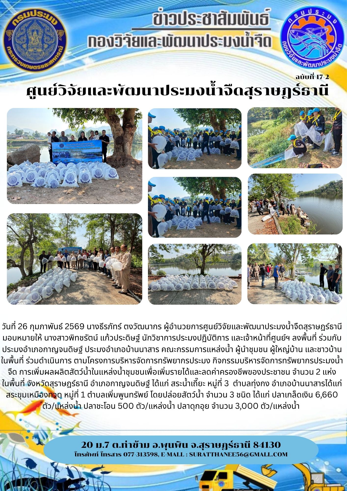 วันที่ 26 กุมภาพันธ์ 2569 นางธีรภัทร์ ตงวัฒนากร ผู้อำนวยการศูนย์วิจัยและพัฒนาประมงน้ำจืดสุราษฎร์ธานี มอบหมายให้ นางสาวพิทชรัตน์ แก้วประดิษฐ์ นักวิชาการประมงปฏิบัติการ และเจ้าหน้าที่ศูนย์ฯ ลงพื้นที่ ร่วมกับ ประมงอำเภอกาญจนดิษฐ์ ประมงอำเภอบ้านนาสาร คณะกรรมการแหล่งน้ำ ผู้นำชุมชน ผู้ใหญ่บ้าน และชาวบ้านในพื้นที่ ร่วมดำเนินการ ตามโครงการบริหารจัดการทรัพยากรประมง กิจกรรมบริหารจัดการทรัพยากรประมงน้ำจืด การเพิ่มผลผลิตสัตว์น้ำในแหล่งน้ำชุมชนเพื่อเพิ่มรายได้และลดค่าครองชีพของประชาชน จำนวน 2 แห่ง ในพื้นที่ จังหวัดสุราษฎร์ธานี