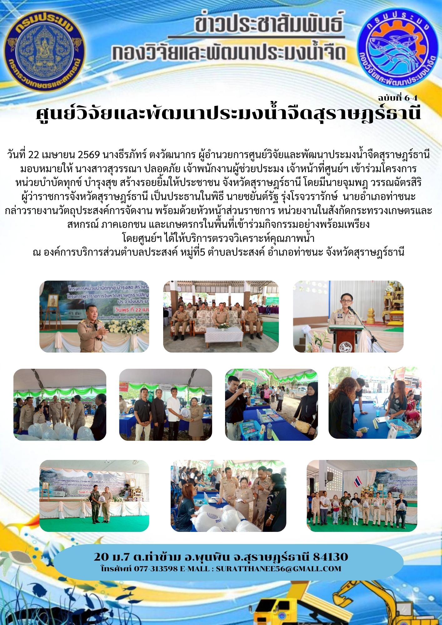 วันที่ 22 เมษายน 2569 นางธีรภัทร์ ตงวัฒนากร ผู้อำนวยการศูนย์วิจัยและพัฒนาประมงน้ำจืดสุราษฎร์ธานี มอบหมายให้ นางสาวสุวรรณา ปลอดภัย เจ้าพนักงานผู้ช่วยประมง เจ้าหน้าที่ศูนย์ฯ เข้าร่วมโครงการ หน่วยบำบัดทุกข์ บำรุงสุข สร้างรอยยิ้มให้ประชาชน จังหวัดสุราษฎร์ธานี โดยมีนายจุมพฎ วรรณฉัตรสิริ ผู้ว่าราชการจังหวัดสุราษฎร์ธานี เป็นประธานในพิธี นายชยันต์รัฐ รุ่งโรจวรารักษ์ นายอำเภอท่าชนะ กล่าวรายงานวัตถุประสงค์การจัดงาน พร้อมด้วยหัวหน้าส่วนราชการ หน่วยงานในสังกัดกระทรวงเกษตรและสหกรณ์ ภาคเอกชน และเกษตรกรในพื้นที่เข้าร่วมกิจกรรมอย่างพร้อมเพรียง โดยศูนย์ฯ ได้ให้บริการตรวจวิเคราะห์คุณภาพน้ำ ณ องค์การบริการส่วนตำบลประสงค์ หมู่ที่5 ตำบลประสงค์ อำเภอท่าชนะ จังหวัดสุราษฎร์ธานี