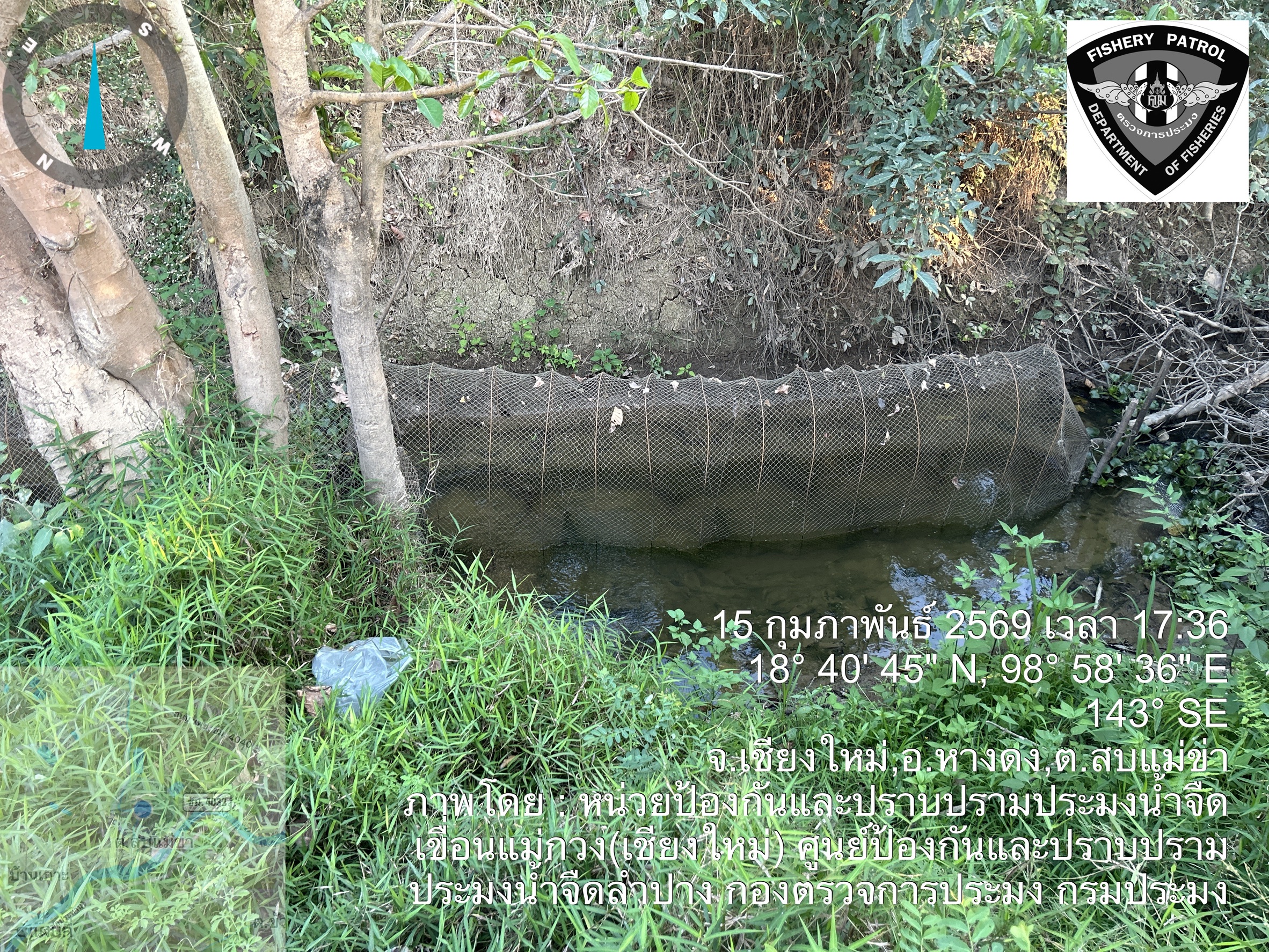 วันที่ 15 กุมภาพันธ์ 2569 หน่วยป้องกันและปราบปรามประมงน้ำจืดเขื่อนแม่กวง (เชียงใหม่) โดย ว่าที่ ร.ต.ธนาคม จันทร์แสงทอง ตำแหน่งเจ้าพนักงานประมงปฏิบัติงาน พร้อมเจ้าหน้าที่รวม 5 นาย ออกปฏิบัติงานควบคุมและเฝ้าระวังการทำประมงผิดกฎหมายในพื้นที่รับผิดชอบ  ดำเนินการรื้อถอนเครื่องมือลอบพับได้หรือไอ้โง่ฯ ในลำคลองสาธารณะ เชื่อมต่อกับคลองแม่ข่า ตำบลสบแม่ข่า อำเภอหางดง  จังหวัดเชียงใหม่ และนำของกลางดังกล่าวส่งพนักงานสอบสวน สภ.หางดง ตาม ปจว. ข้อ 8 เวลา 19.08 น. ลงวันที่ 15 กุมภาพันธ์ 2569