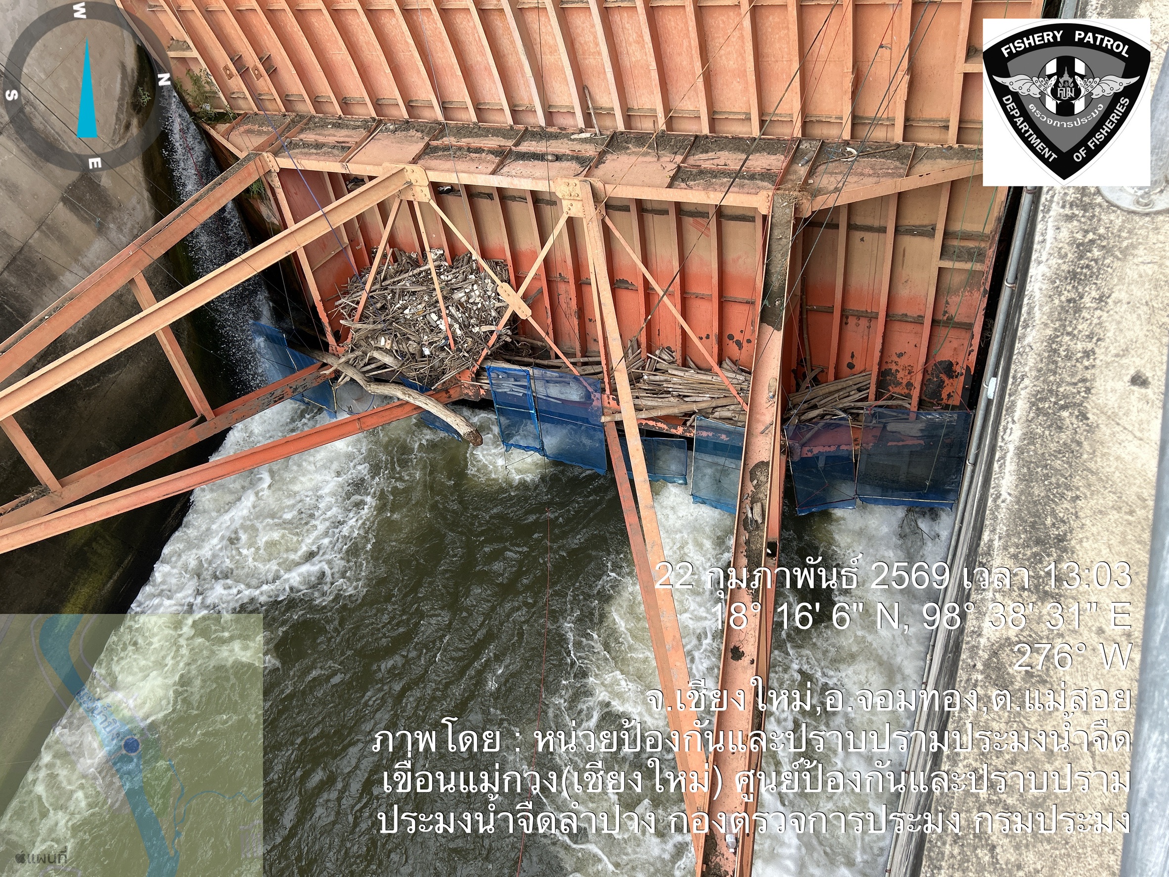 วันที่ 22 กุมภาพันธ์ 2569 หน่วยป้องกันและปราบปรามประมงน้ำจืดเขื่อนแม่กวง (เชียงใหม่) โดย ว่าที่ ร.ต.ธนาคม จันทร์แสงทอง ตำแหน่งเจ้าพนักงานประมงปฏิบัติงาน พร้อมเจ้าหน้าที่รวม 3 นาย ลงพื้นที่ตรวจสอบการลักลอบใช้เครื่องมือทำการประมงผิดกฏหมาย ตามภารกิจเร่งด่วนโดยการแจ้งเบาะแสจากเครือข่ายเฝ้าระวังการทำประมงในแม่น้ำปิง พื้นที่ตำบลแม่สอย อำเภอจอมทอง จังหวัดเชียงใหม่ ผลการปฏิบัติงาน ดำเนินการรื้อถอนเครื่องมือโต่งเต้นฯ พร้อมเชือกผูกรั้ง จำนวน 17 ชุด บริเวณประตูระบายน้ำ ช่องที่ 5,6 และ7 โครงการประตูระบายน้ำแม่สอย (แม่น้ำปิง) ตำบลแม่สอย อำเภอจอมทอง  จังหวัดเชียงใหม่ และนำของกลางดังกล่าว ส่งพนักงานสอบสวน สภ.จอมทอง ตาม ปจว. ข้อ 1 เวลา 15.29 น. ลงวันที่ 22 กุมภาพันธ์ 2569