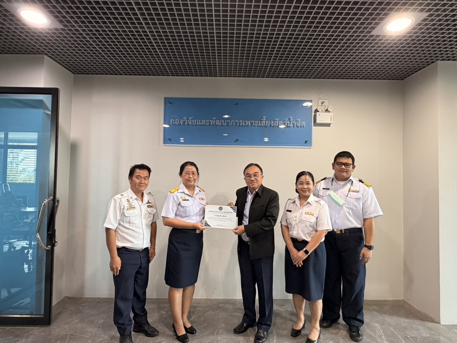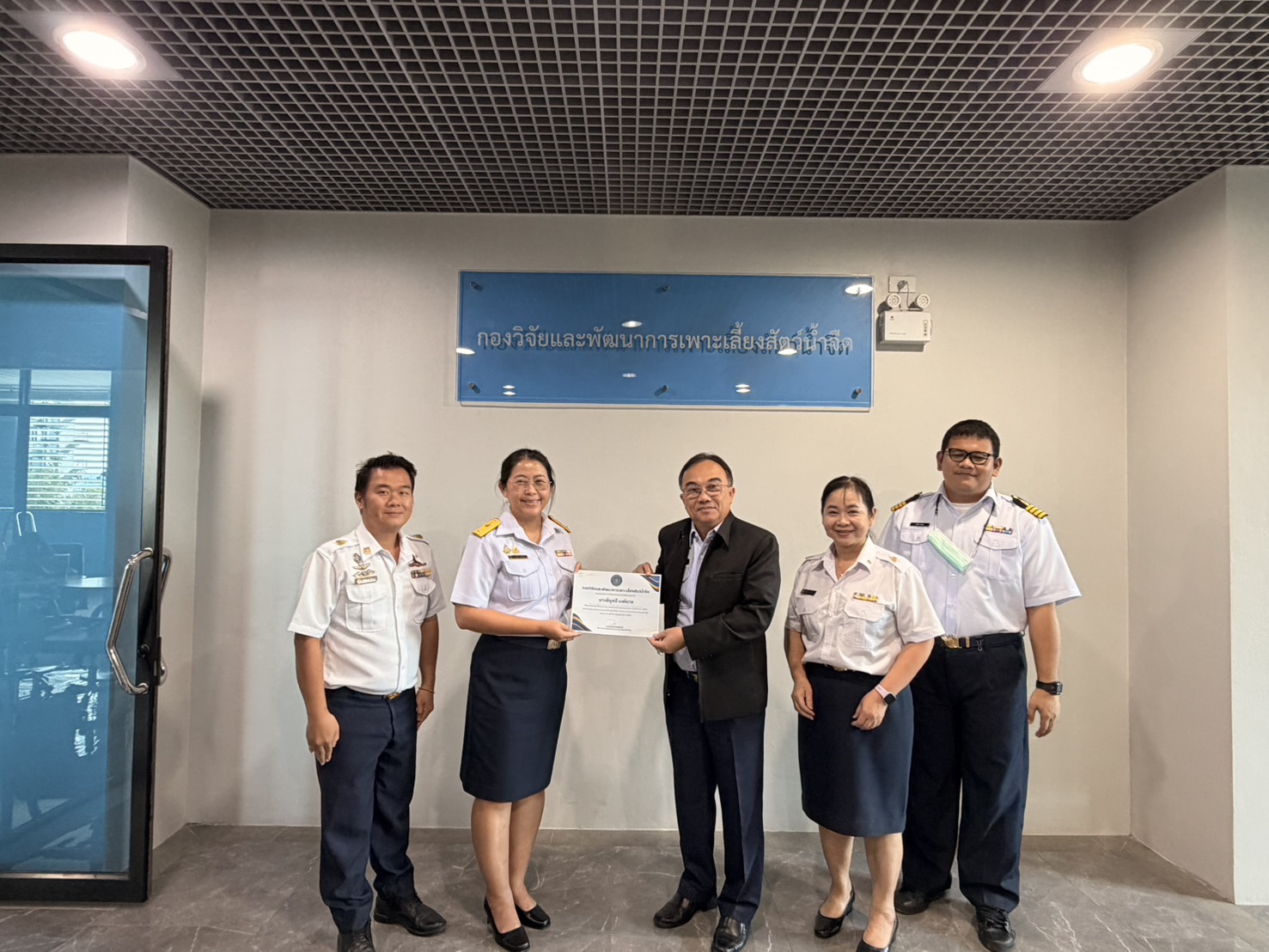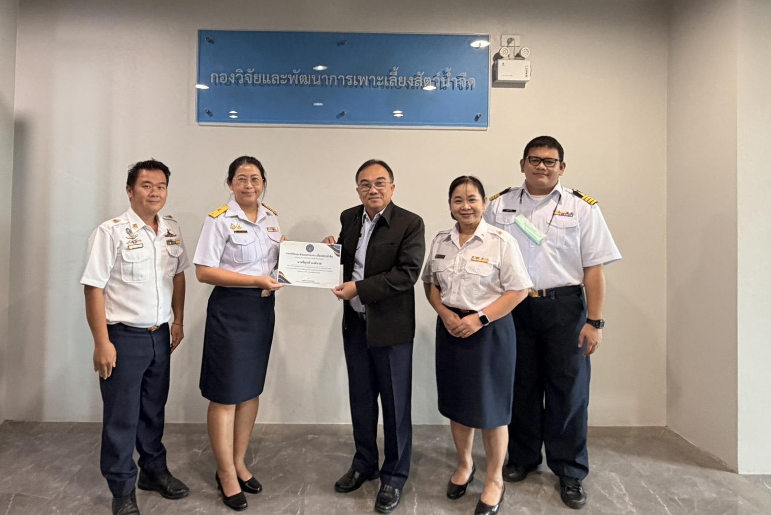วันที่ 9  มีนาคม 2569 เวลา 11.00 - 12.00 น. ชั้น 3 อาคารจรัลธาดา กรรณสูต กรมประมง นายวิศณุพร รัตนตรัยวงศ์ รองอธิบดีกรมประมง ได้มอบเกียรติบัตรยกย่องเชิดชูเกียรติข้าราชการดีเด่น ประจำปี พ.ศ. ๒๕๖๘ แก่นางอัญชลี นงค์นวล นักวิชาการประมงชำนาญการพิเศษ หัวหน้ากลุ่มวิชาการ ณ กองวิจัยและพัฒนาการเพาะเลี้ยงสัตว์น้ำจืด โดยมีคณะผู้บริหารและบุคลากรของกองฯ ร่วมแสดงความยินดี ทั้งนี้ การมอบเกียรติบัตรดังกล่าวมีวัตถุประสงค์เพื่อยกย่องเชิดชูเกียรติผู้ที่มีความมุ่งมั่น ตั้งใจปฏิบัติหน้าที่ด้วยความรับผิดชอบ เสียสละ และเป็นแบบอย่างที่ดีในการปฏิบัติราชการ อันจะเป็นแรงผลักดันให้บุคลากรในหน่วยงานพัฒนางานอย่างต่อเนื่องต่อไป
