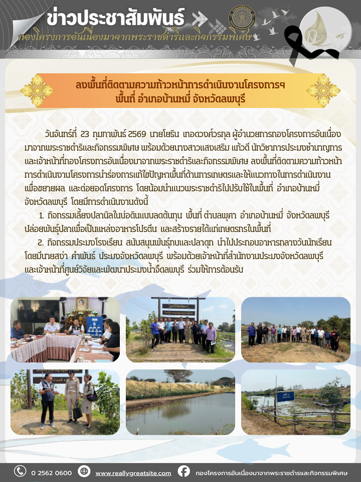 นายโยธิน เทอดวงศ์วรกุล ผู้อำนวยการกองโครงการอันเนื่องมาจากพระราชดำริและกิจกรรมพิเศษ พร้อมด้วยนางสาวแสงเสริม แก้วดี นักวิชาการประมงชำนาญการ และเจ้าหน้าที่กองโครงการอันเนื่องมาจากพระราชดำริและกิจกรรมพิเศษ ลงพื้นที่ติดตามความก้าวหน้าการดำเนินงานโครงการนำร่องการแก้ไขปัญหาพื้นที่ด้านการเกษตร และให้แนวทางในการดำเนินงานเพื่อขยายผลและต่อยอดโครงการ โดยน้อมนำแนวพระราชดำริไปปรับใช้ในพื้นที่อำเภอบ้านหมี่ จังหวัดลพบุรี โดยมีการดำเนินงานดังนี้