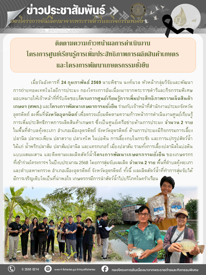 ผอ. กองโครงการอันเนื่องมาจากพระราชดำริและกิจกรรมพิเศษ มอบหมายให้เจ้าหน้าที่กลุ่มวิจัยและพัฒนาการถ่ายทอดเทคโนโลยีการประมง