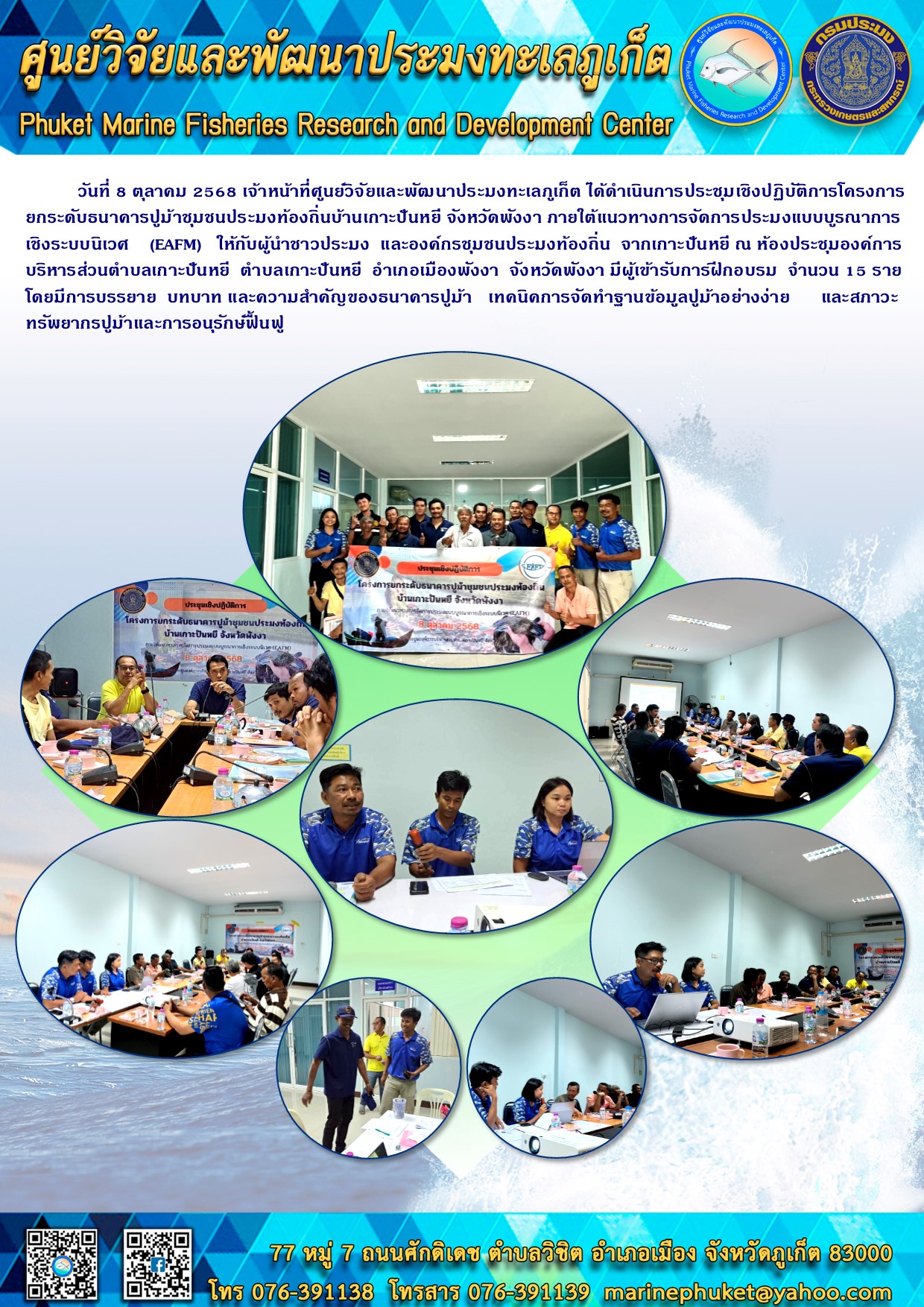 วันที่ 8 ตุลาคม 2568 เจ้าหน้าที่ศูนย์วิจัยและพัฒนาประมงทะเลภูเก็ต ได้ดำเนินการประชุมเชิงปฏิบัติการโครงการยกระดับธนาคารปูม้าชุมชนประมงท้องถิ่นบ้านเกาะปันหยี จังหวัดพังงา ภายใต้แนวทางการจัดการประมงแบบบูรณาการเชิงระบบนิเวศ (EAFM)