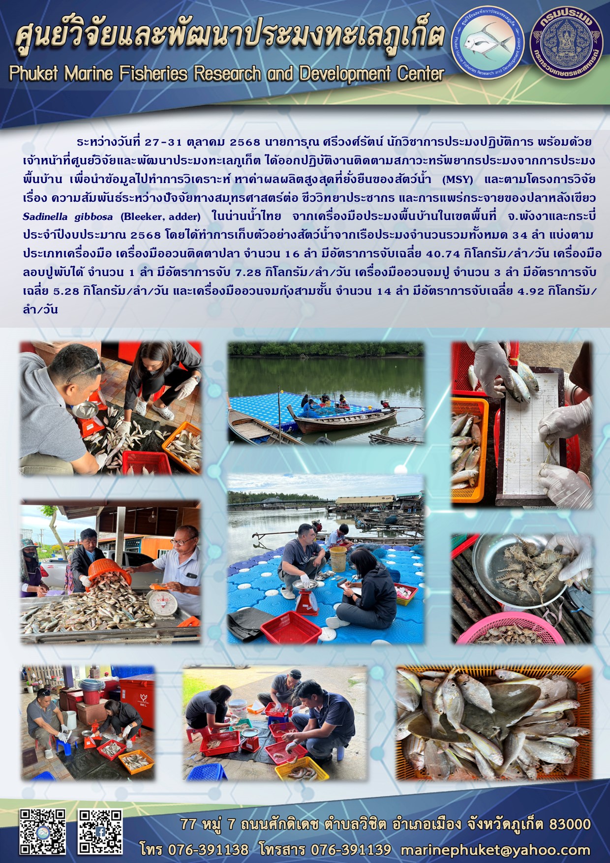 ระหว่างวันที่ 27-31 ตุลาคม 2568 เจ้าหน้าที่ศูนย์วิจัยและพัฒนาประมงทะเลภูเก็ต ได้ออกปฏิบัติงานติดตามสภาวะทรัพยากรประมงจากการประมงพื้นบ้านในเขตพื้นที่ จ.พังงาและกระบี่