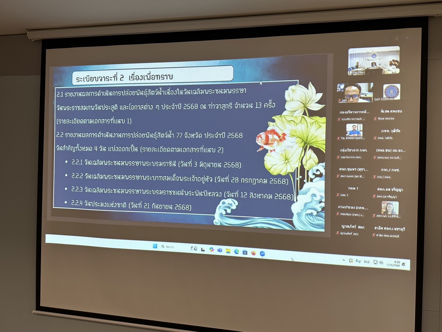 วันพุธที่ 1 ตุลาคม 2568 เวลา 09.30 - 12.00 น. กองโครงการอันเนื่องมาจากพระราชดำริและกิจกรรมพิเศษ จัดประชุมหารือโครงการปล่อยพันธุ์สัตว์น้ำ ประจำปี 2569