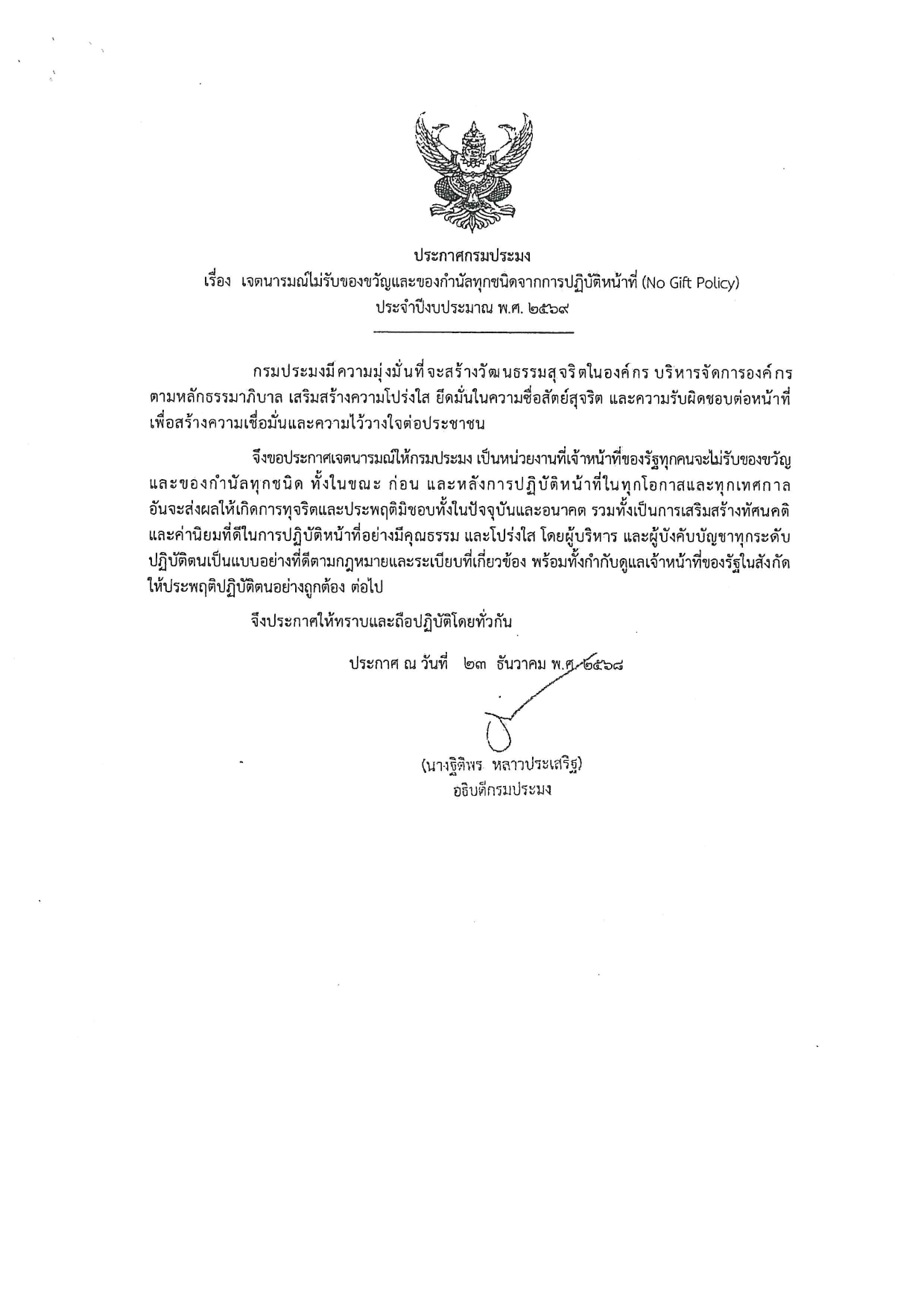 ประกาศเจตนารมณ์ไม่รับของขวัญและของกำนัลทุกชนิดจากการปฏิบัติหน้าที่ (No Gift Policy) ประจำปีงบประมาณ พ.ศ. 2569