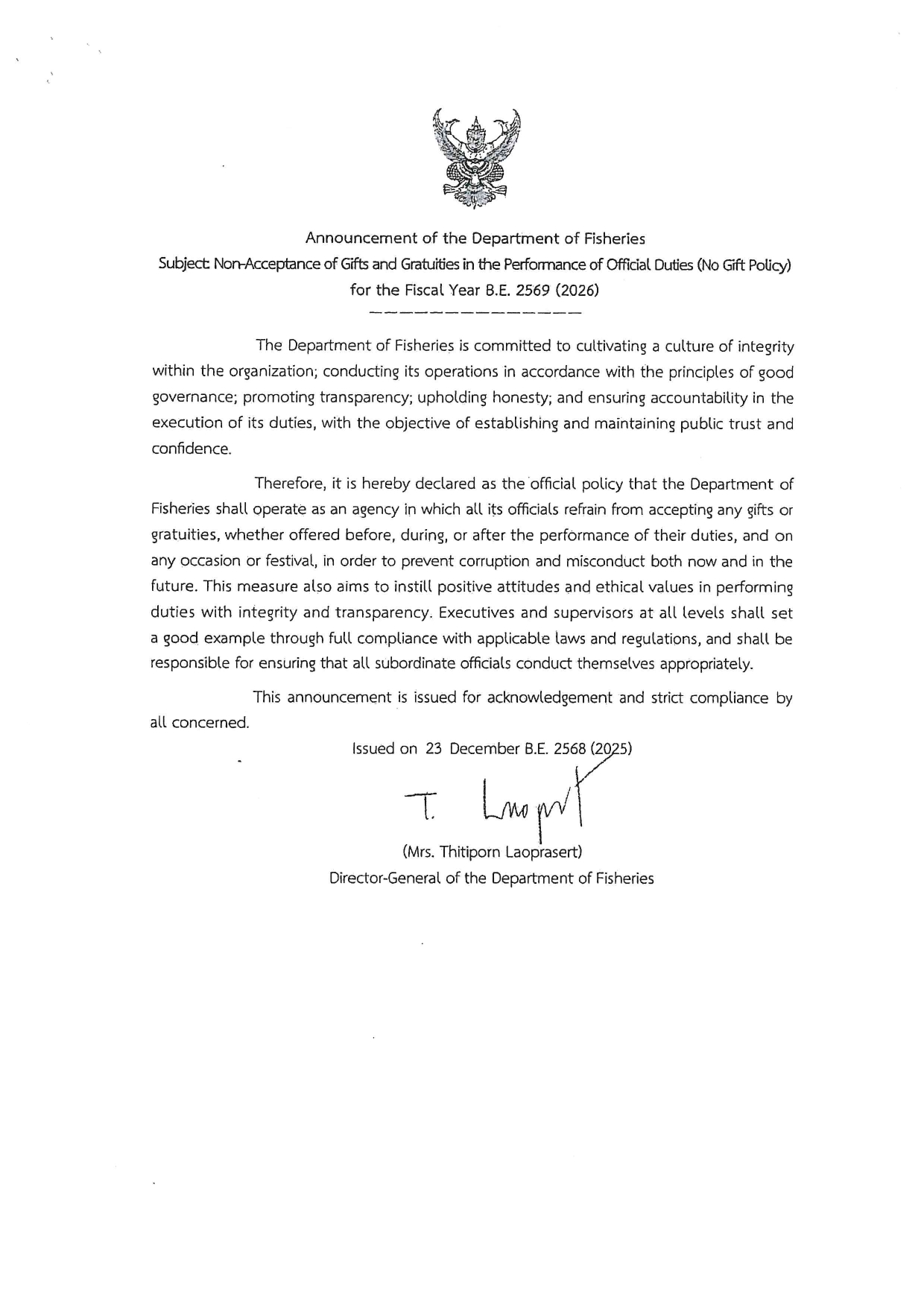 ประกาศเจตนารมณ์ไม่รับของขวัญและของกำนัลทุกชนิดจากการปฏิบัติหน้าที่ (No Gift Policy) ประจำปีงบประมาณ พ.ศ. 2569 ของกลุ่มโครงการอันเนื่องมาจากพระราชดำริ กองโครงการอันเนื่องมาจากพระราชดำริและกิจกรรมพิเศษ กรมประมง
