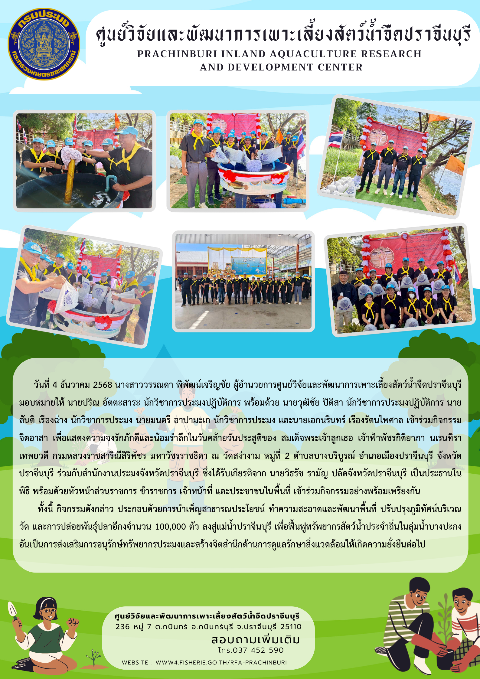 วันที่ 4 ธันวาคม 2568 นางสาววรรณดา พิพัฒน์เจริญชัย ผู้อำนวยการศูนย์วิจัยและพัฒนาการเพาะเลี้ยงสัตว์น้ำจืดปราจีนบุรี มอบหมายให้ นายปริณ อัตตะสาระ นักวิชาการประมงปฏิบัติการ พร้อมด้วย นายวุฒิชัย ปิติสา นักวิชาการประมงปฏิบัติการ นายสันติ เรืองฉ่าง นักวิชาการประมง นายมนตรี อาปามะเก นักวิชาการประมง และนายเอกนรินทร์ เรืองรัตนไพศาล เข้าร่วมกิจกรรมจิตอาสา เพื่อแสดงความจงรักภักดีและน้อมรำลึกในวันคล้ายวันประสูติของ สมเด็จพระเจ้าลูกเธอ เจ้าฟ้าพัชรกิติยาภา นเรนทิราเทพยวดี กรมหลวงราชสาริณีสิริพัชร มหาวัชรราชธิดา ณ วัดสง่างาม หมู่ที่ 2 ตำบลบางบริบูรณ์ อำเภอเมืองปราจีนบุรี จังหวัดปราจีนบุรี ร่วมกับสำนักงานประมงจังหวัดปราจีนบุรี ซึ่งได้รับเกียรติจาก นายวิธรัช รามัญ ปลัดจังหวัดปราจีนบุรี เป็นประธานในพิธี พร้อมด้วยหัวหน้าส่วนราชการ ข้าราชการ เจ้าหน้าที่ และประชาชนในพื้นที่ เข้าร่วมกิจกรรมอย่างพร้อมเพรียงกัน